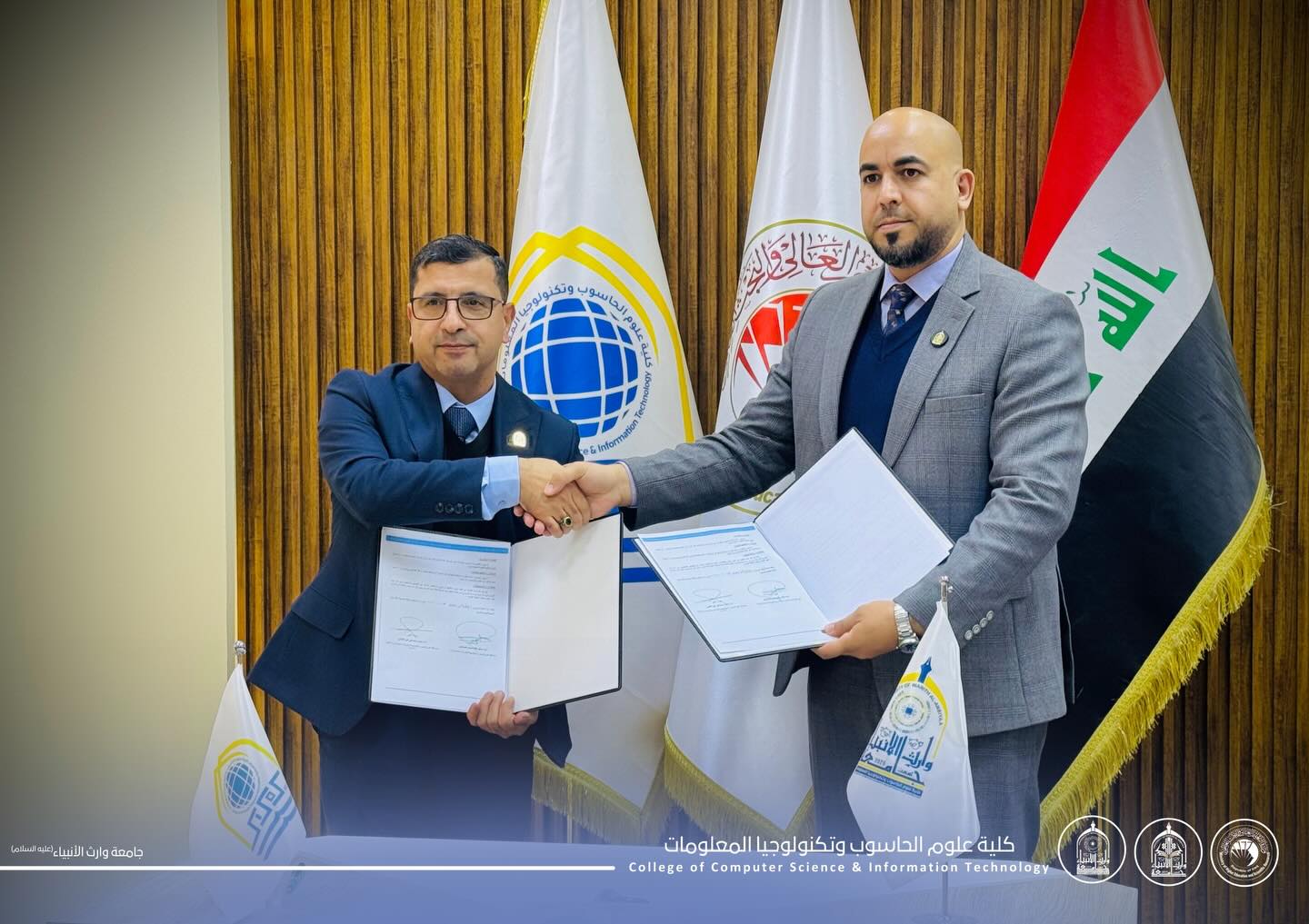 وقّع الأستاذ المساعد الدكتور حيدر محمد علي الغانمي، عميد كلية علوم الحاسوب وتكنولوجيا المعلومات بجامعة وارث الانبياء عليه السلام، اتفاقية توأمة علمية مع الأستاذ المساعد الدكتور موفق كاظم الحسناوي، عميد كلية علوم الحاسوب وتكنولوجيا المعلومات في جامعة كربلاء.