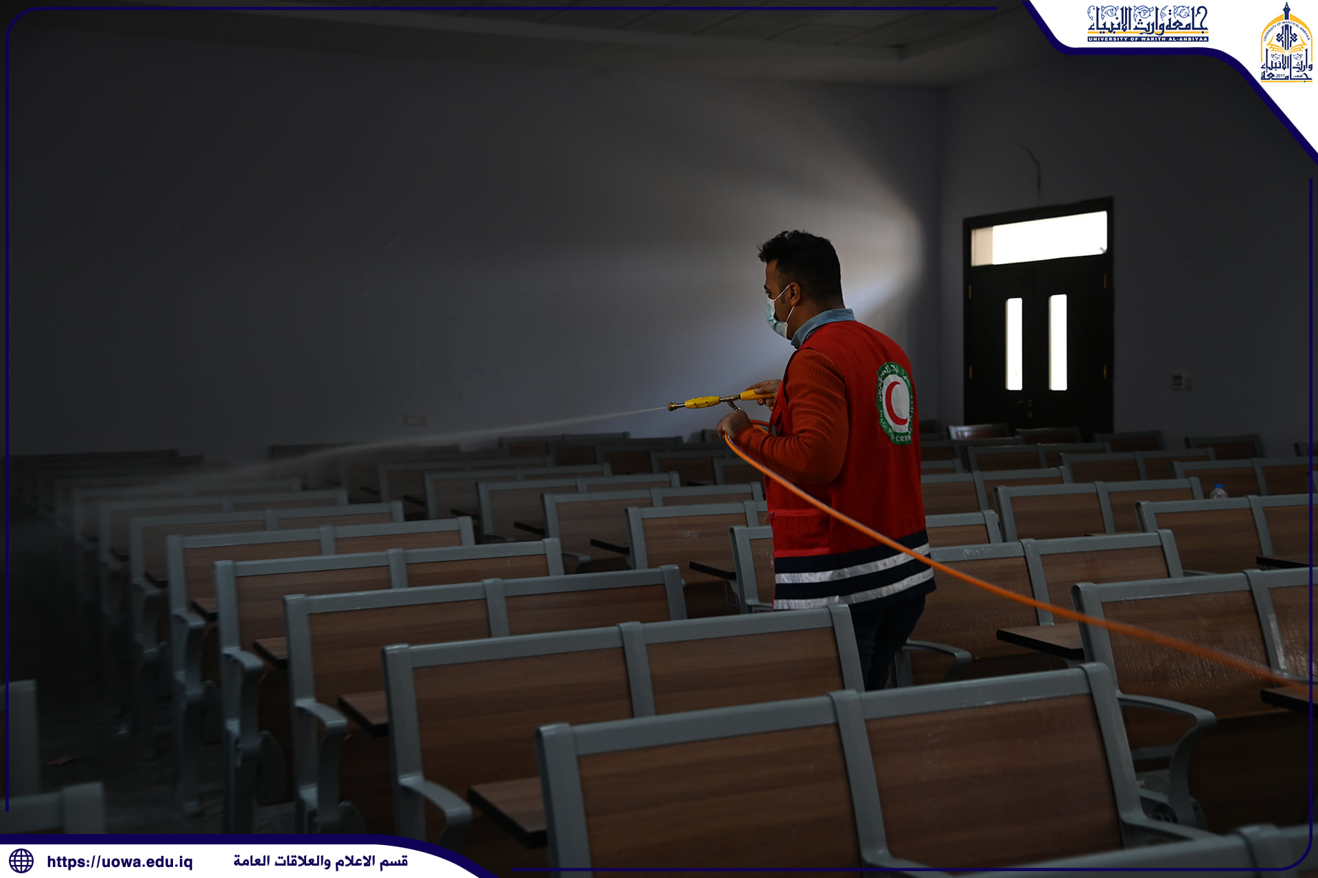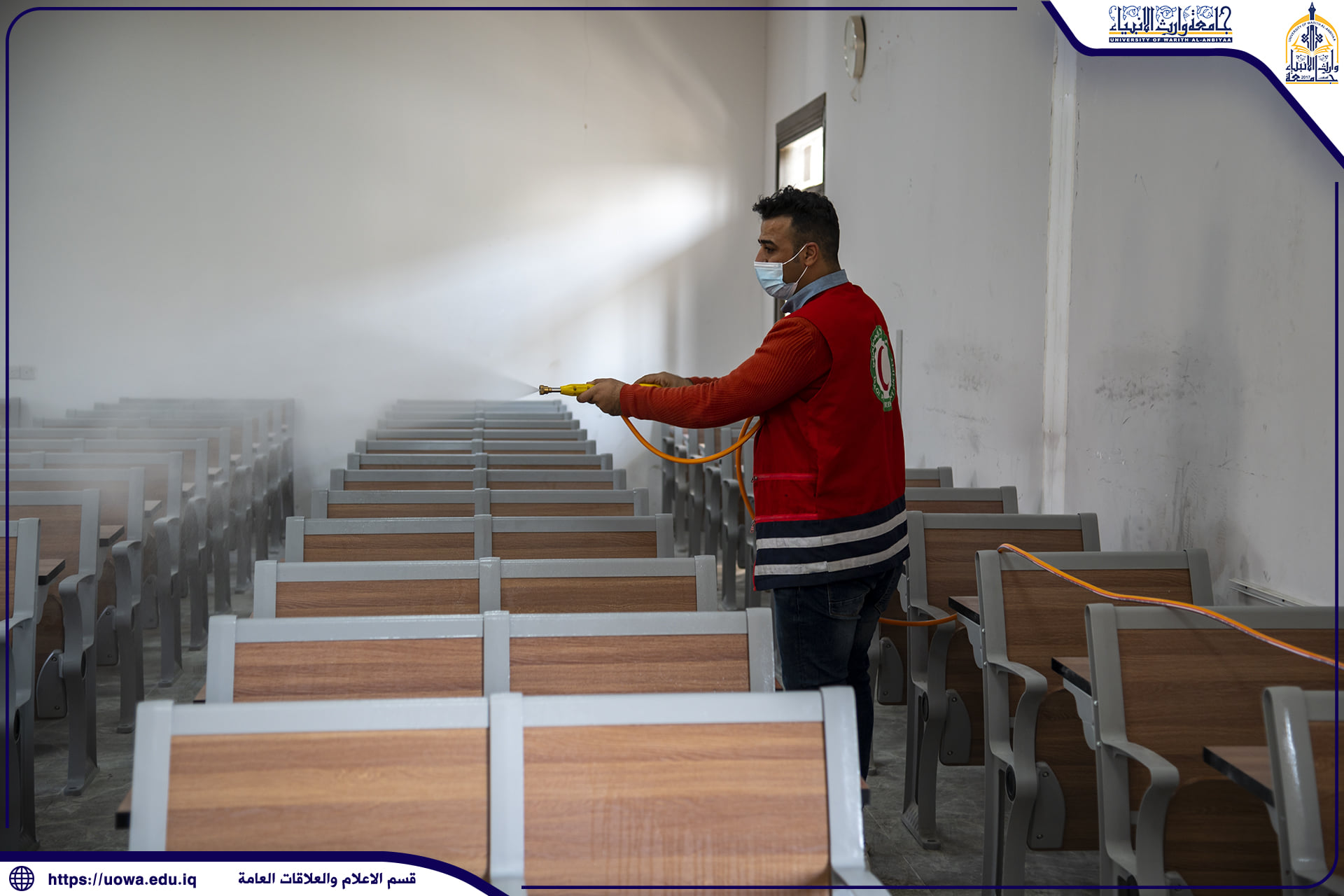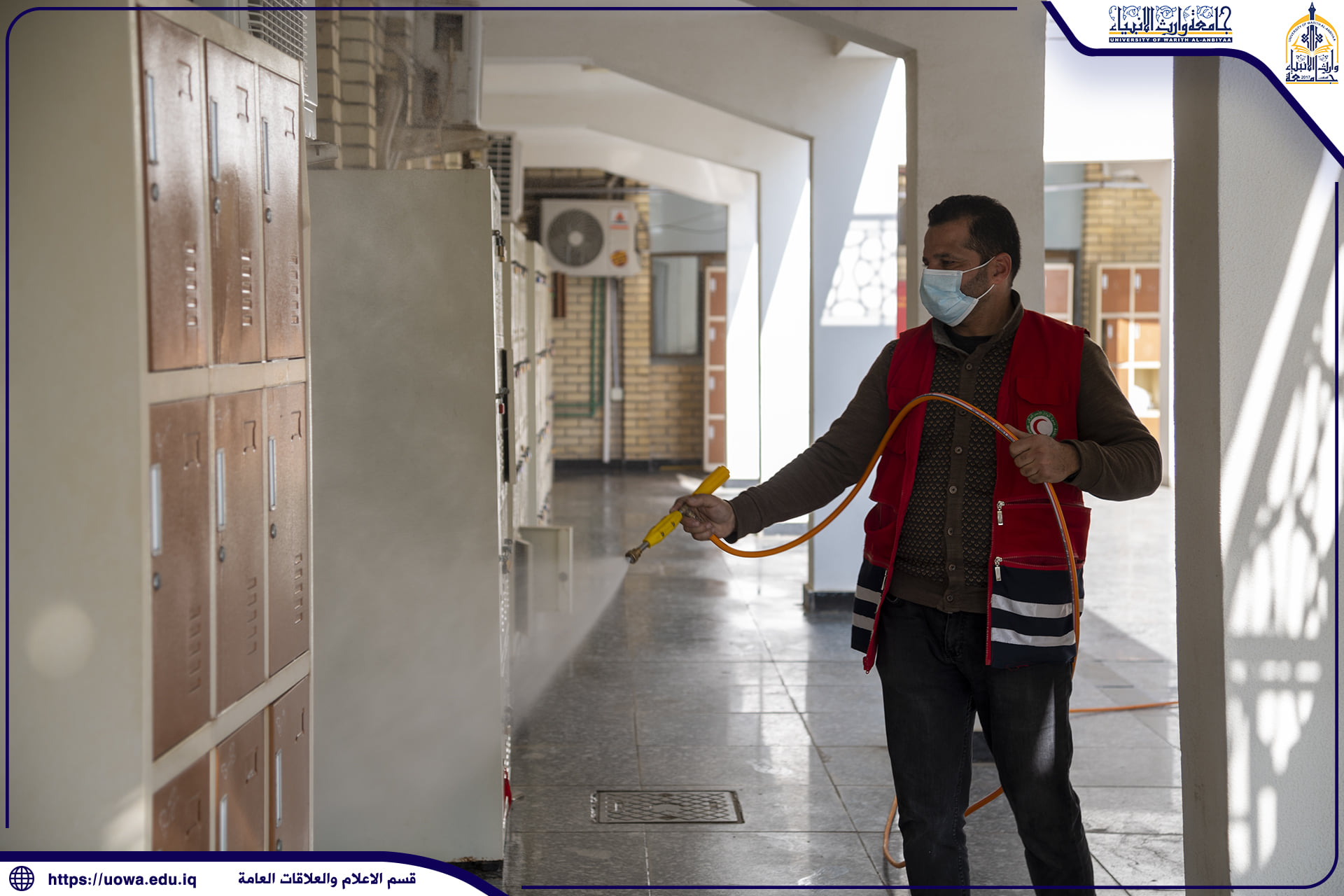 بالصور .. حملة تعفير تنفذها جامعة وارث الانبياء(عليه السلام) بالتعاون مع جمعية الهلال الاحمر العراقية لتعفير ابنية الجامعة وقاعاتها الدراسية والمختبرات العلمية واروقة الجامعة حفاضا على سلامة الجميع.