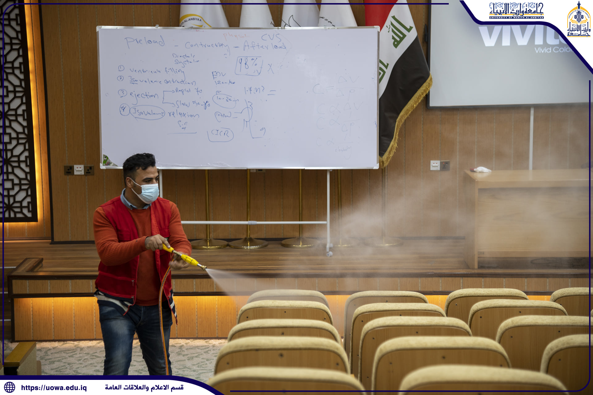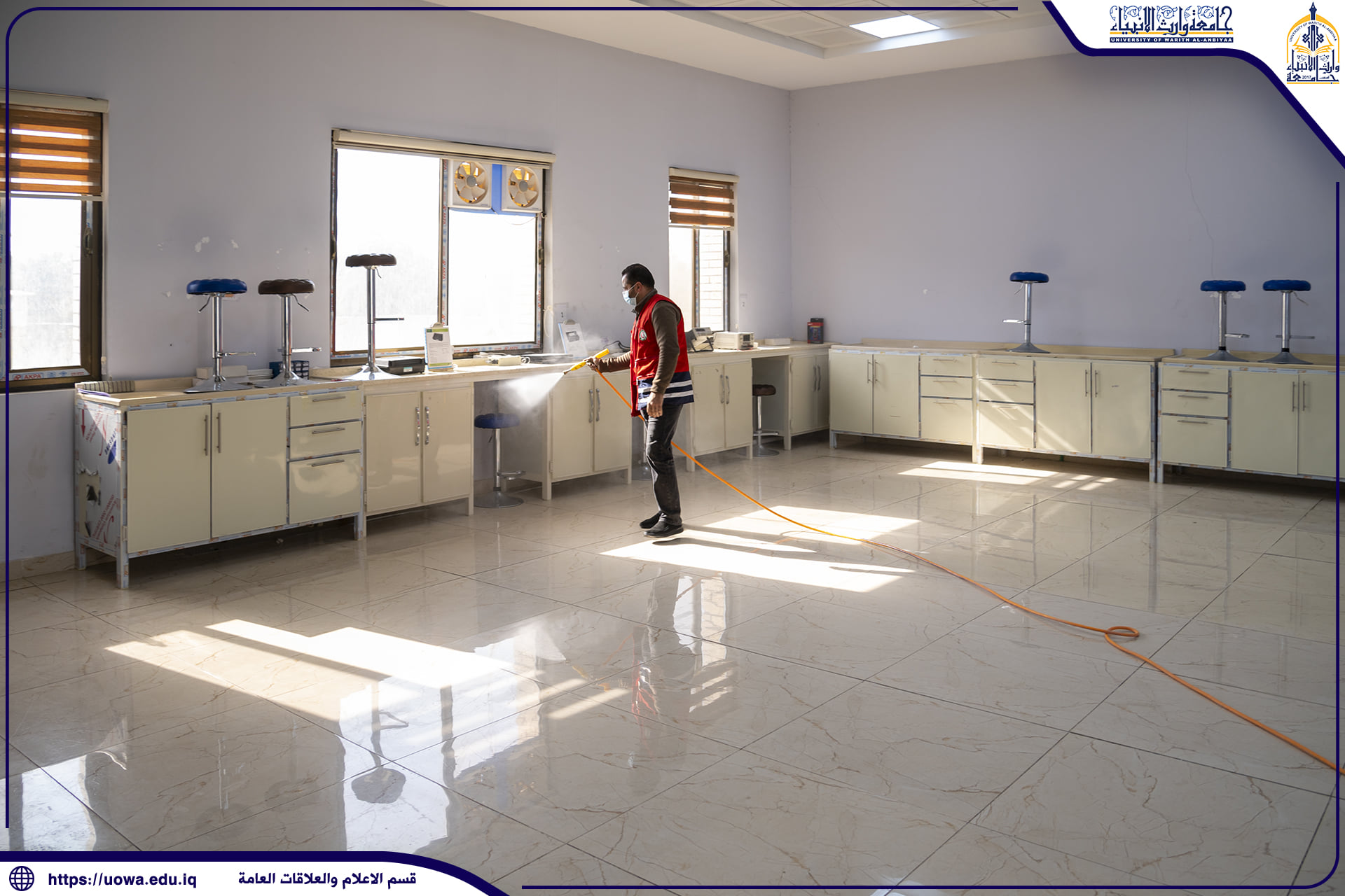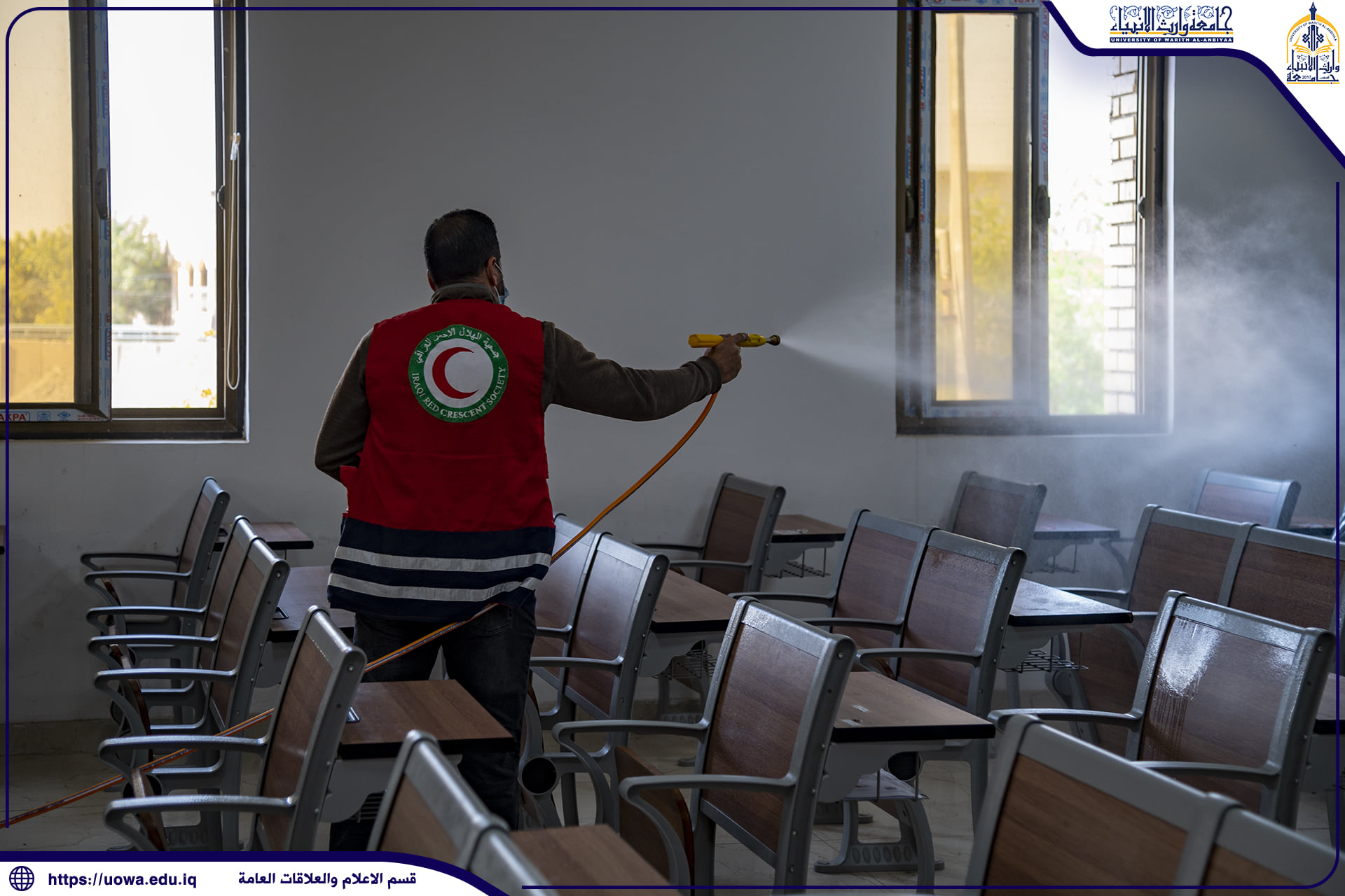بالصور .. حملة تعفير تنفذها جامعة وارث الانبياء(عليه السلام) بالتعاون مع جمعية الهلال الاحمر العراقية لتعفير ابنية الجامعة وقاعاتها الدراسية والمختبرات العلمية واروقة الجامعة حفاضا على سلامة الجميع.