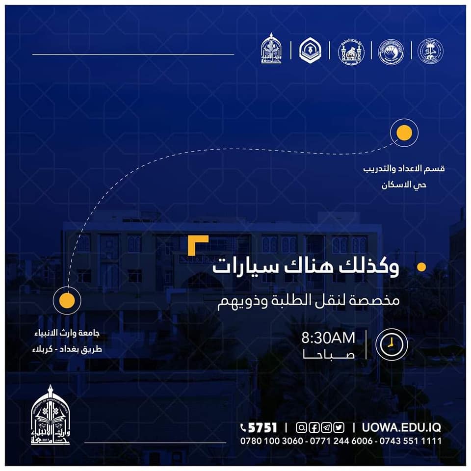 إليكم جدول مواعيد الوجبة الأخيرة للاختبارات الأولية للمواهب والابتكارات الخاصة بالمسابقة، فعلى الطلبة الذين سجلوا في المسابقة ولم يتم اختبارهم الحضور مباشرة بالمواعيد المذكورة في الجدول ادناه الى جامعة وارث الانبياء(عليه السلام) الساعة الـ (9:00) صباحاً، وكذلك هناك سيارات مخصصة لنقل الطلبة وذويهم من قسم الاعداد والتدريب في حي الإسكان الى الجامعة في الساعة (8:30) صباحاً.