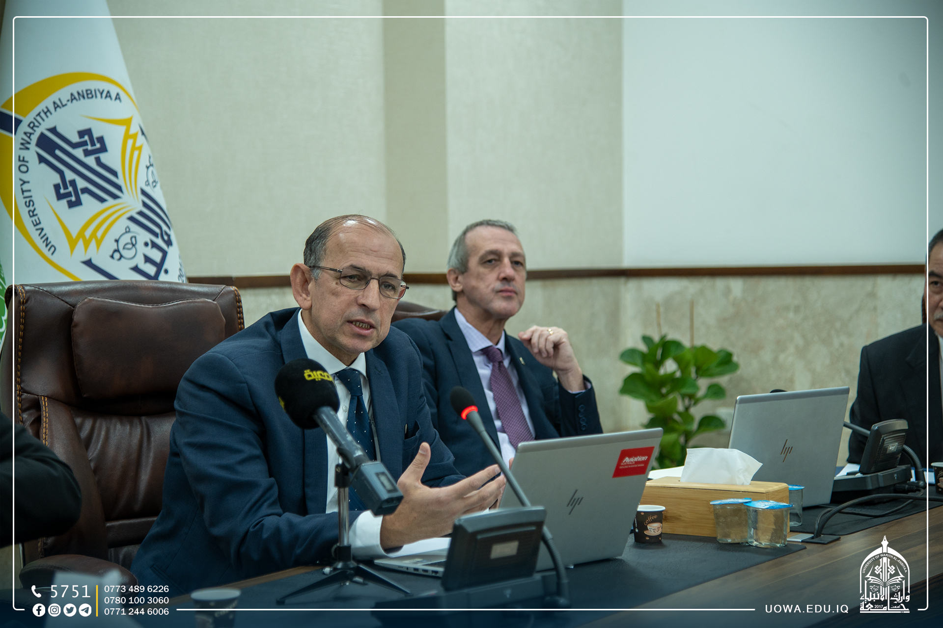 وقال البروفيسور طلال يوسف عميد الدراسات العاليا والتكنولوجيا المستجدة في كوينزلاند في استراليا: نحن فريق دولي يتضمن عدد من الجامعات جاءت زيارتنا الى جامعة وارث الانبياء(عليه السلام) الفتية لتبادل الاراء والتعلم من بعضنا البعض، والاستفادة من تجارب الجامعات العالمية والتباحث حول مواطن القوة التي تمتلكها الجامعة لتتم مخاطبة وزارة التعليم العراقية لتعميم التجربة، فضلاً عن التباحث حول مواطن الضعف لنعمل سوياً على إصلاحها عبر الإفادة من تجارب الجامعات العالمية للخروج بنتائج مرضية.