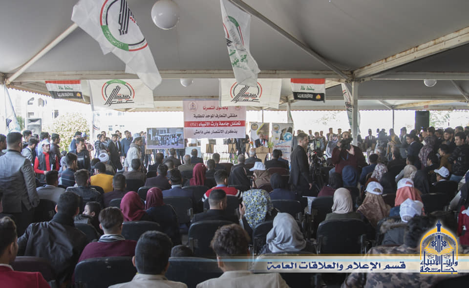 تحت شعار بفتواك انتصرنا وتزامناً مع الذكرى السنوية الاولى للانتصار على عصابات داعش الإجرامية أقامت جامعة وارث الأنبياء وبالتعاون مع مركز رعاية الشباب التابع للعتبة الحسينية المقدسة ملتقى التعارف الموحد لطلبة الجامعة بمناسبة العام الدراسي الجديد وذكرى الانتصار على داعش ، بحضور السيد رئيس الجامعة والمساعد الاداري والعلمي وعمداء الكليات والتدريسيين ، حيث وضم الملتقى افتتاح معرض صوري ونشاطات فنية وفكرية ومشاركات شعرية للطلبة تغنت بحب الوطن والمقدسات.