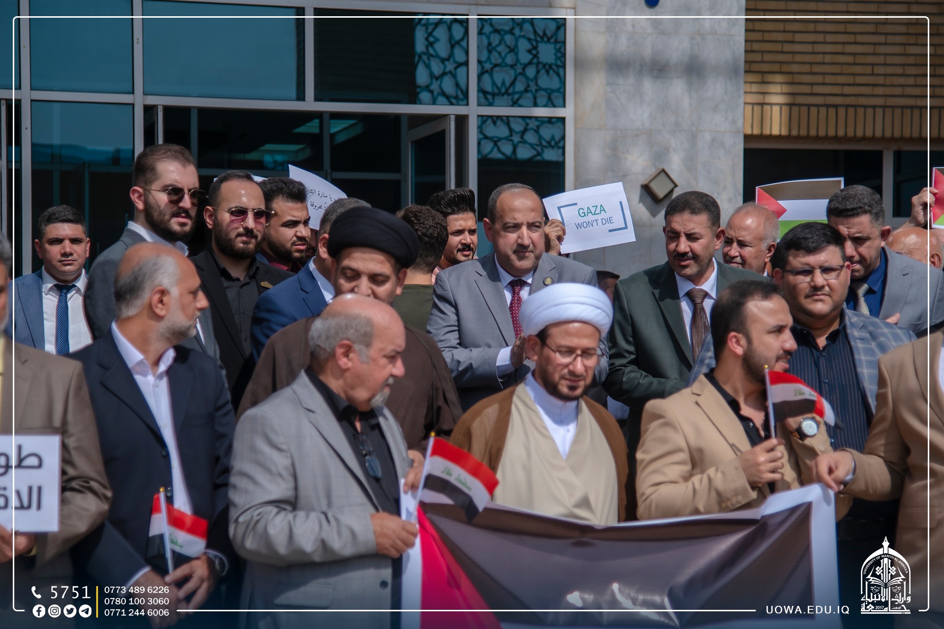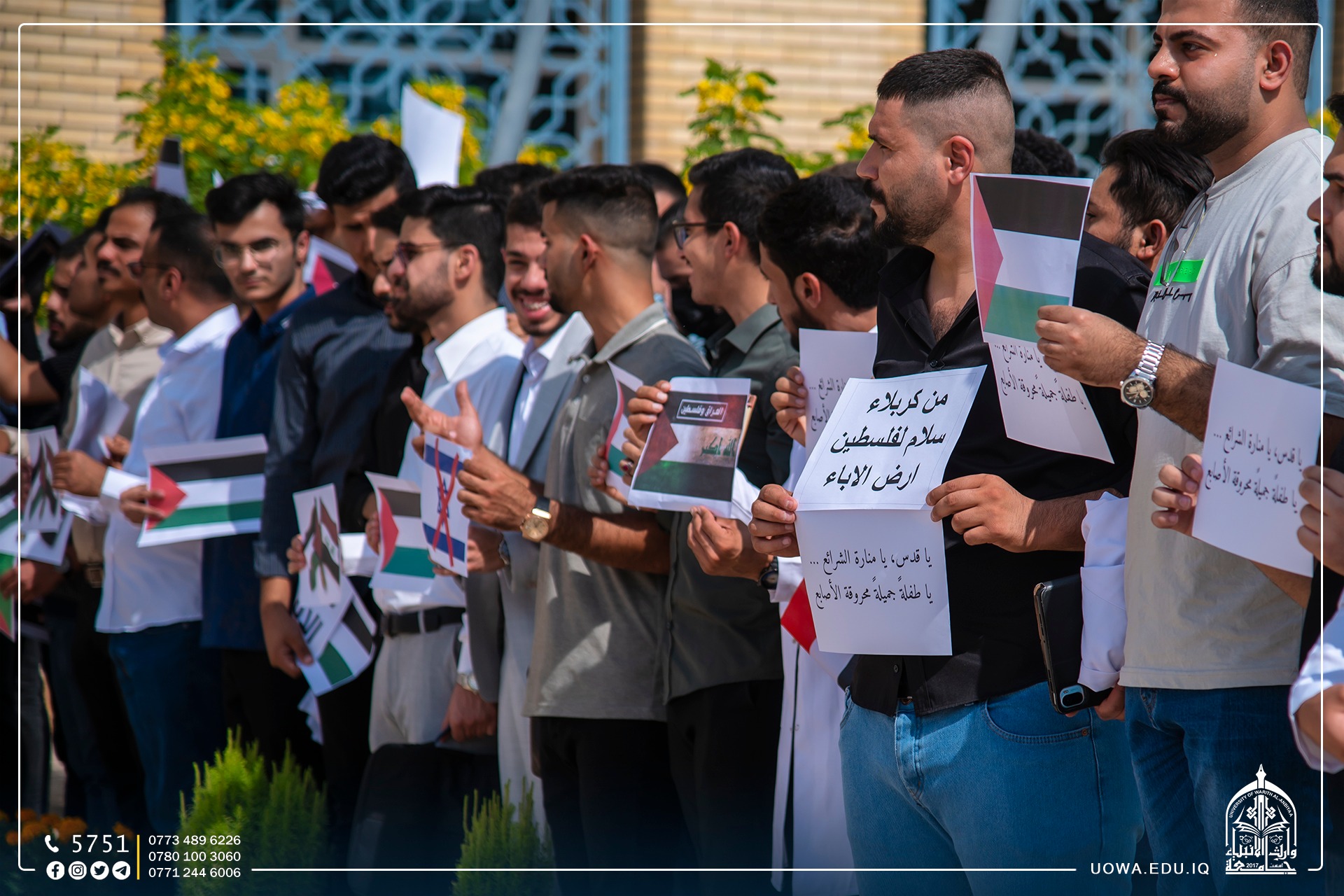 جامعة وارث الانبياء(عليه السلام) تنظم وقفة تضامنية مع الشعب الفلسطيني، وتؤكد مساندتها للشعب الفلسطيني الأبيّ في مقاومته الباسلة للمحتلين، وإن العالم كله مدعوّ للوقوف في وجه هذا التوحش الفظيع ومنع تمادي قوات الاحتلال عن تنفيذ مخططاتها لإلحاق مزيد من الأذى بالشعب الفلسطيني المظلوم، ويجري هذا بمرأى ومسمع العالم كله ولا رادع ولا مانع، بل هناك من يساند هذه الأعمال الإجرامية ويبرّرها بذريعة الدفاع عن النفس!