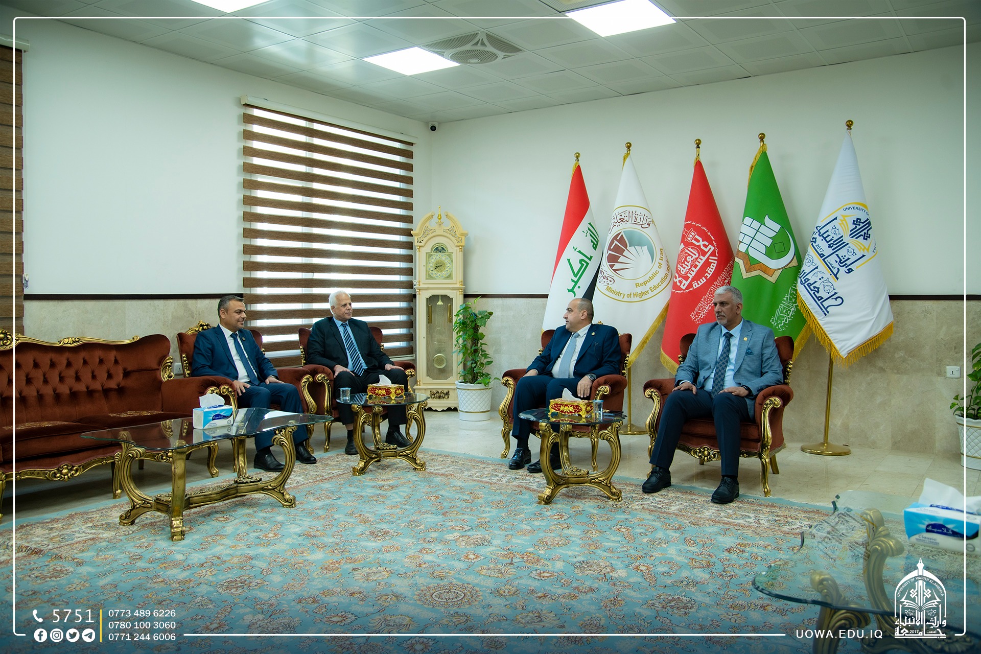 استقبل رئيس الجامعة الاستاذ الدكتور ابراهيم الحياوي، رئيس جامعة كربلاء الاستاذ الدكتور باسم خليل السعيدي، يرافقه المساعد الإداري الاستاذ الدكتور اكرم الياسري الذين زار الجامعة لتقديم التهاني للاستاذ الدكتور واقد الموسوي بمناسبة تسنمه مهام  مساعد رئيس الجامعة للشؤون العلمية سائلًا  الله عزوجل له الاستمرار في طريق العلم وخدمته لسالكيه وقاصديه وفاء لعراقنا الحبيب.