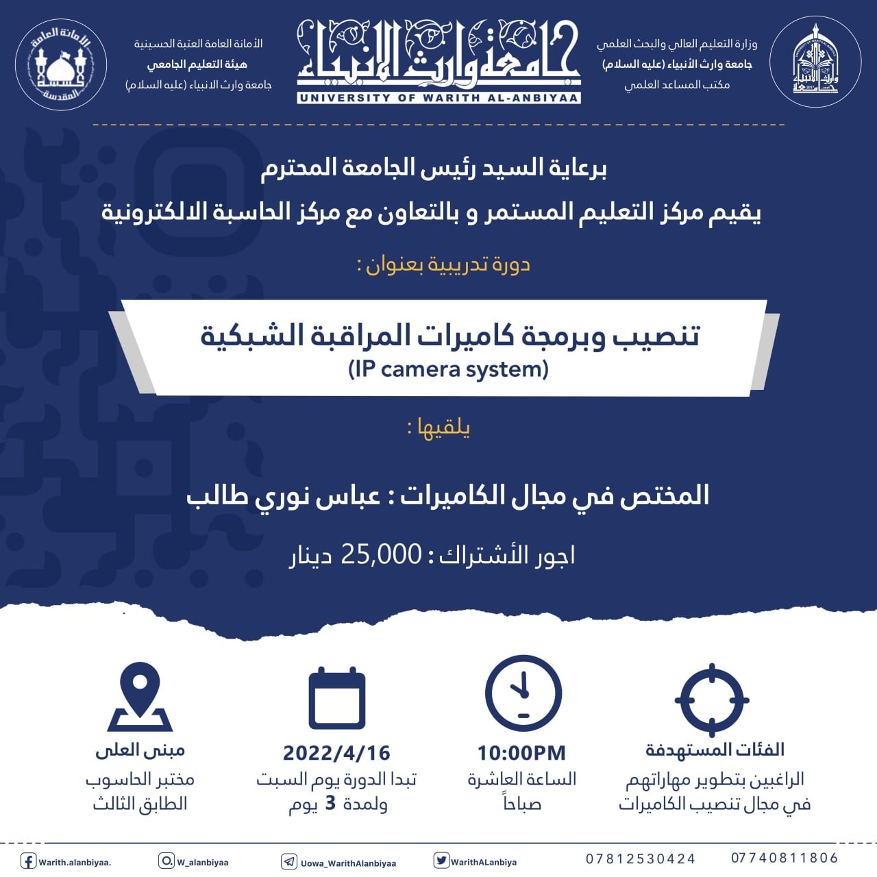 برعاية رئيس الجامعة الاستاذ الدكتور ابراهيم الحياوي نظم مركز التعليم المستمر بالتعاون مع مركز الحاسبة الالكترونية دورة تدريبية بعنوان " تنصيب وبرمجة كاميرات المراقبة الشبكية" IP camera system وذلك ابتداءً من السبت الموافق 16-4-2022 ولمدة ثلاثة أيام