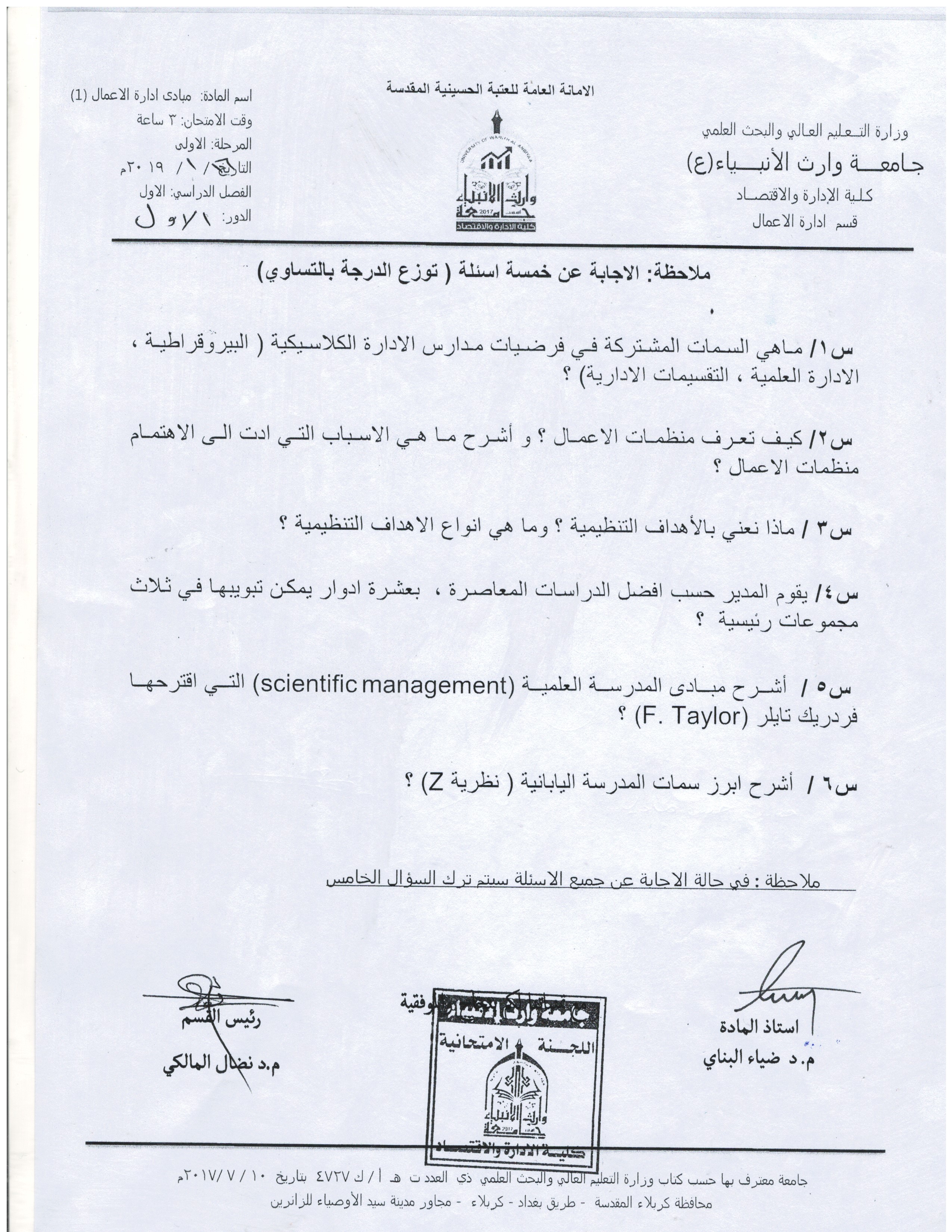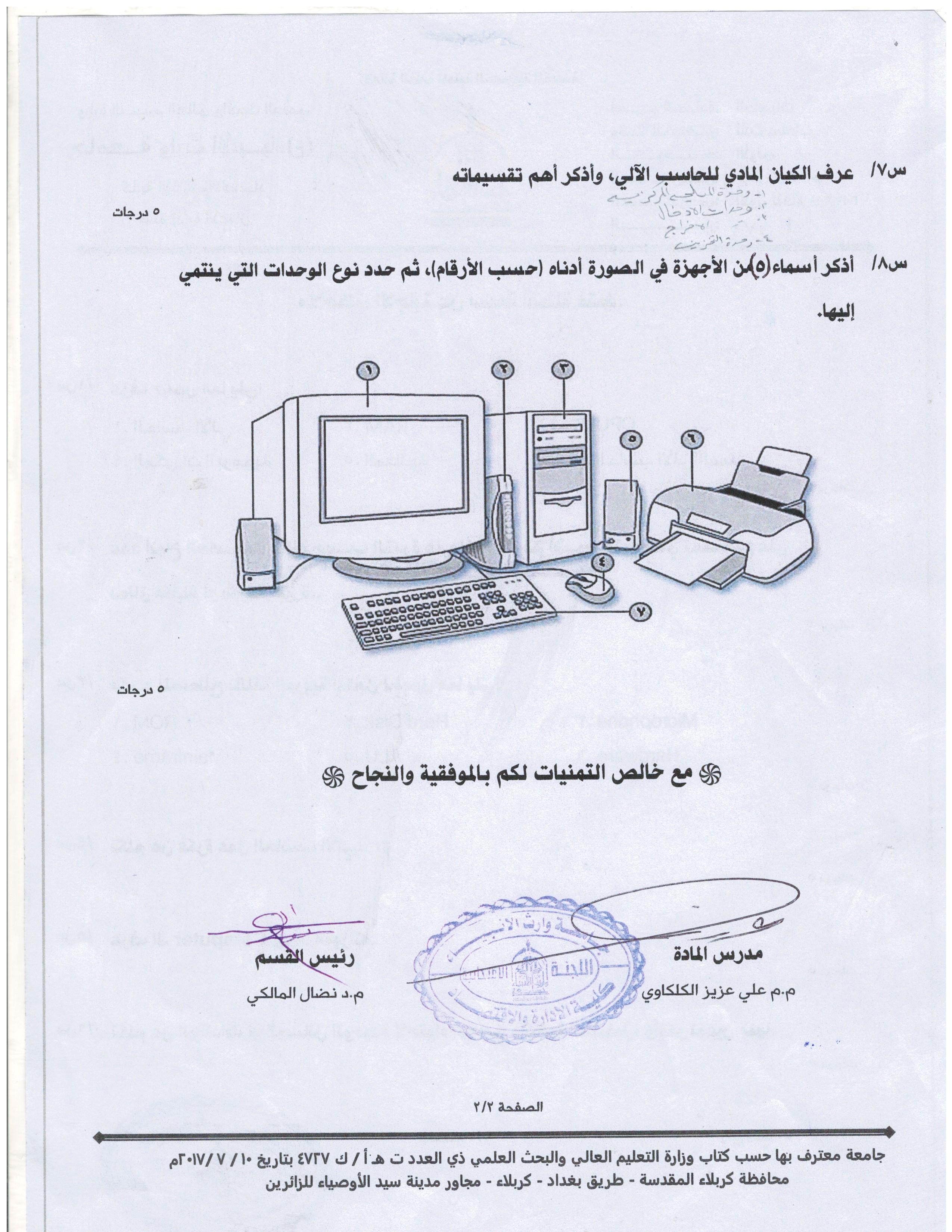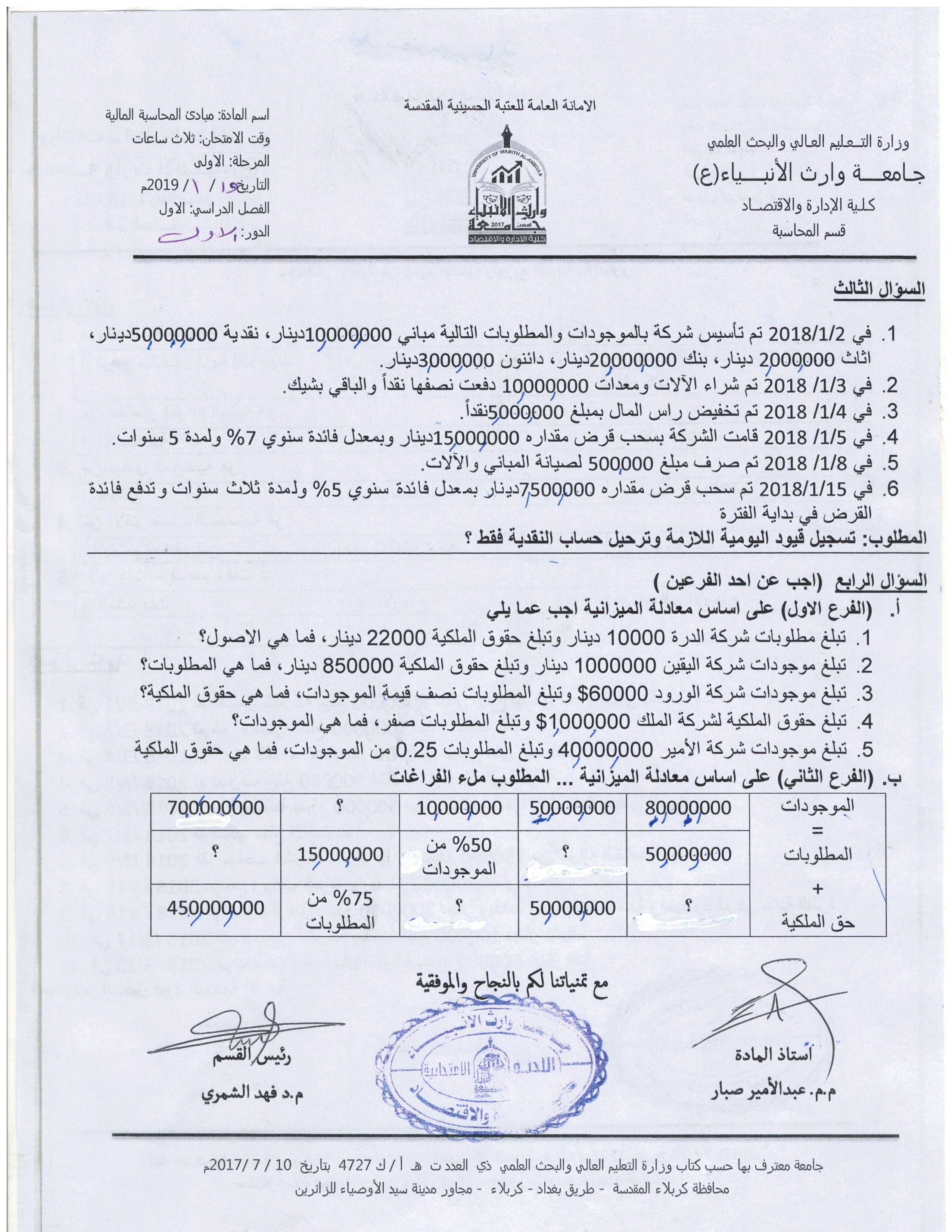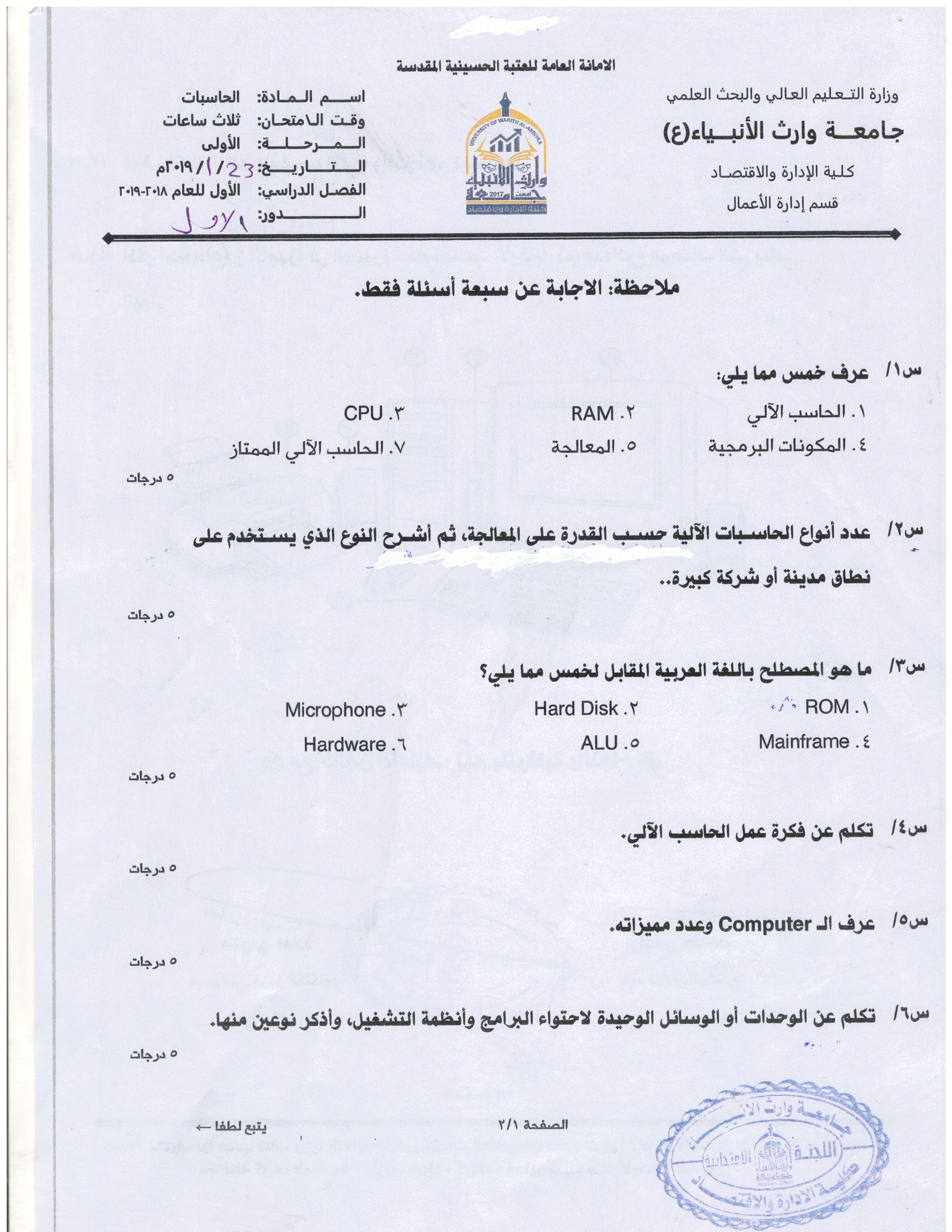 بعض اسئلة الكورس الاول للمرحلة الاولى والثانية ولقسمي المحاسبة وادارة الاعمال