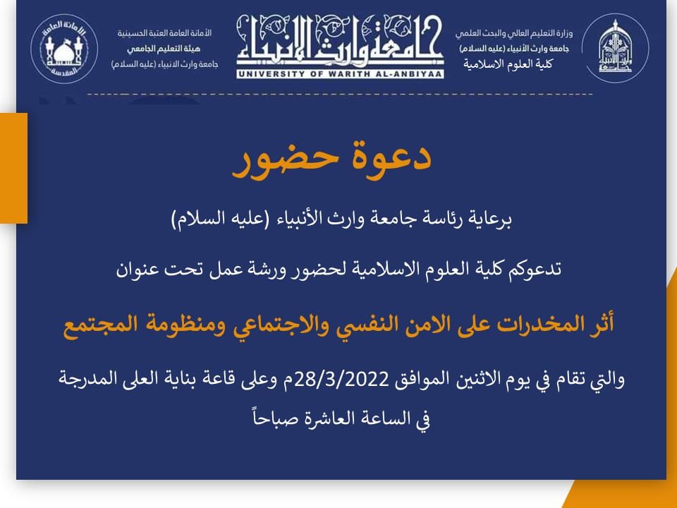 تقيم لجنة النشاطات الطلابية وبإشراف عمادة كلية العلوم الإسلامية ندوة علمية حول ذكرى ولادة الامام الحسن عليه السلام وذلك في يوم الجمعة الموافق 15/4/2022 في تمام الساعة العاشرة والنصف مساء ...