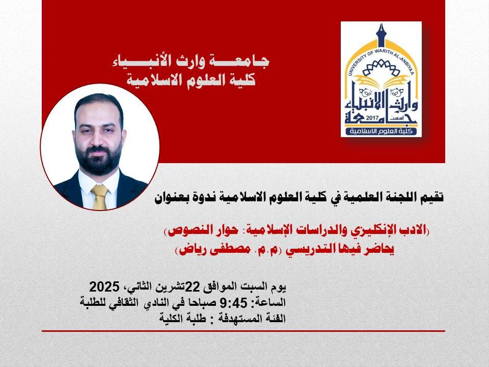 كلية العلوم الاسلامية تدعو طلبتها لحضور الندوة العلمية الموسومة (الأدب الإنكليزي والدراسات الإسلامية: حوار النصوص)