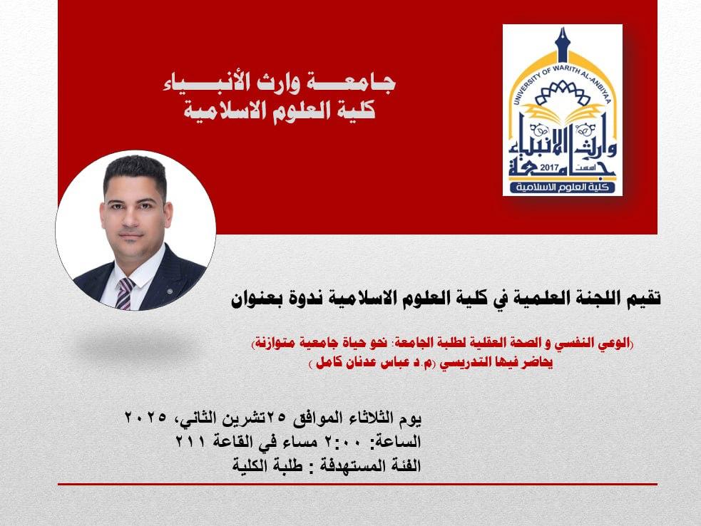 تتشرف اللجنة العلمية في كلية العلوم الإسلامية – جامعة وارث الأنبياء (عليه السلام) بدعوتكم لحضور الندوة العلمية الموسومة: