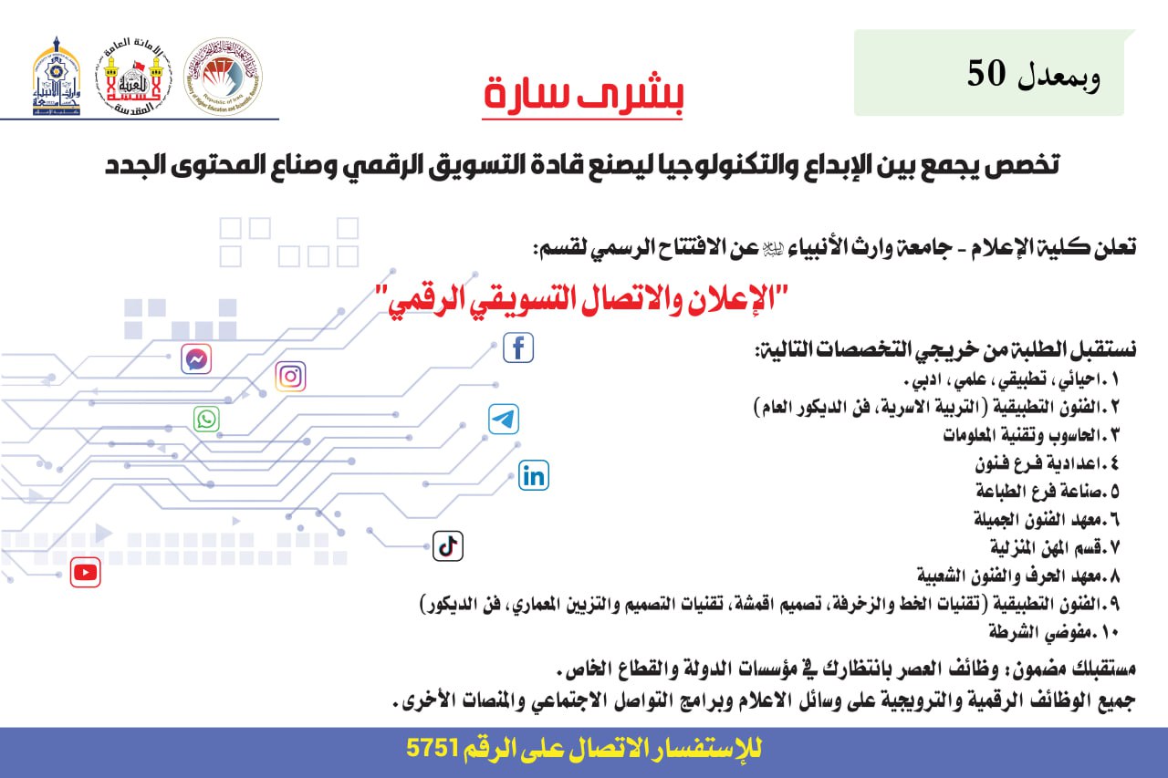 اعلنت كلية الاعلام في جامعة وارث الانبياء عن اطلاق قسمها الجديد الذي حمل عنوان قسم الاعلان والاتصال التسويقي الرقمي