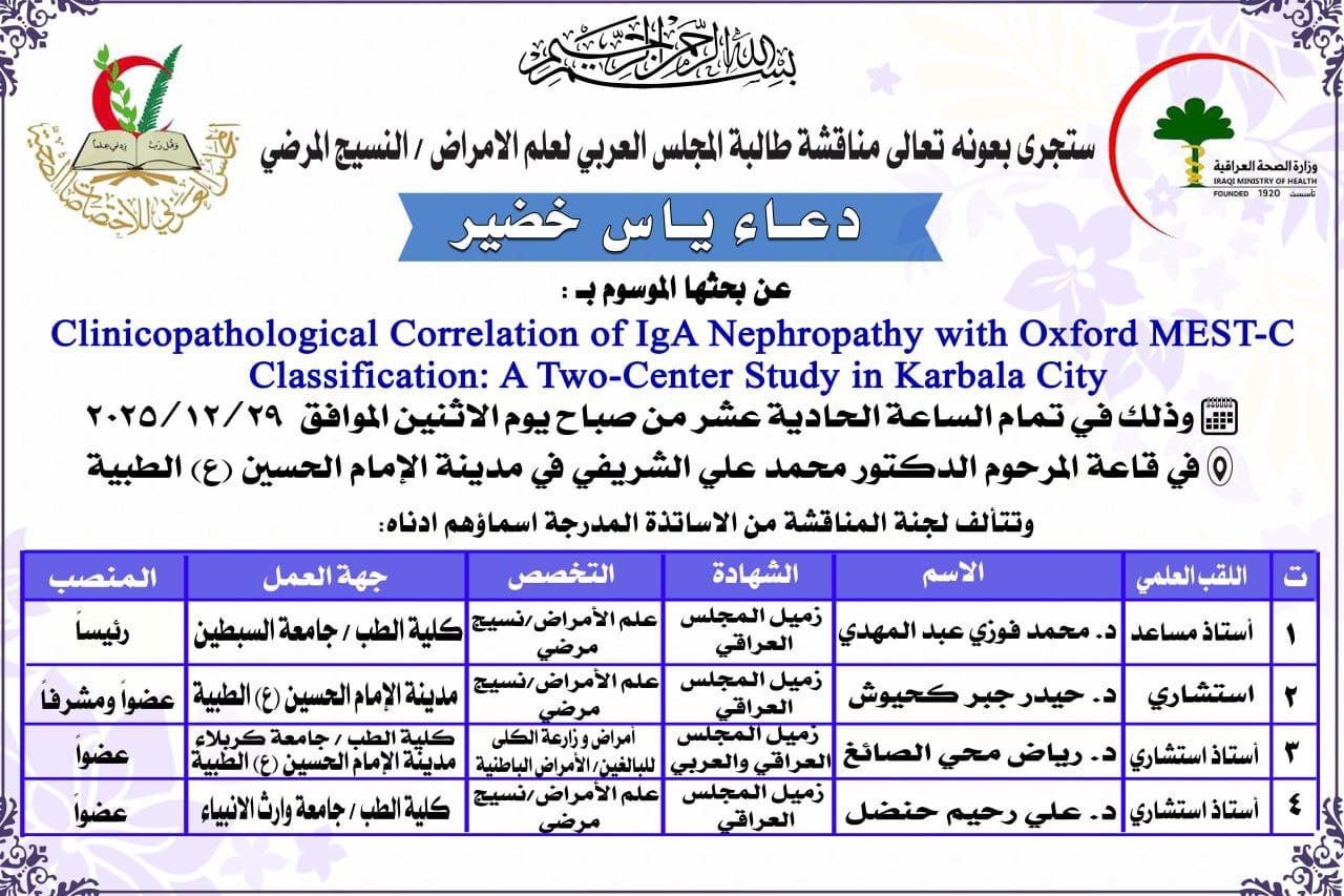 أقيمت على قاعة المرحوم الدكتور محمد علي الشريفي في مدينة الإمام الحسين ( ع ) الطبية ,اليوم الاثنين 29/12/2025 مناقشة البحث المُقدم من قبلالدكتورة دعاء ياس خضير تألفت اللجنة كل من