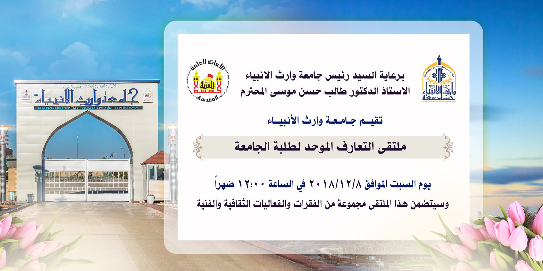 تحت شعار بفتواك انتصرنا وتزامناً مع الذكرى السنوية الاولى للانتصار على عصابات داعش الإجرامية أقامت جامعة وارث الأنبياء وبالتعاون مع مركز رعاية الشباب التابع للعتبة الحسينية المقدسة ملتقى التعارف الموحد لطلبة الجامعة بمناسبة العام الدراسي الجديد وذكرى الانتصار على داعش ، بحضور السيد رئيس الجامعة والمساعد الاداري والعلمي وعمداء الكليات والتدريسيين ، حيث وضم الملتقى افتتاح معرض صوري ونشاطات فنية وفكرية ومشاركات شعرية للطلبة تغنت بحب الوطن والمقدسات.
