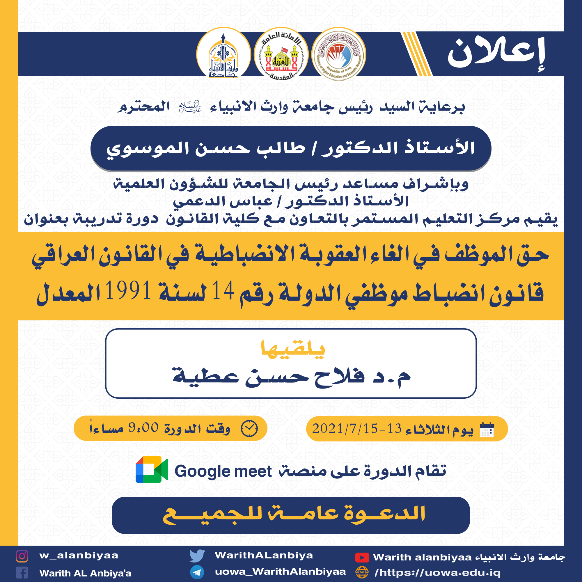 إقامة كلية القانون الحلقة النقاشية تحت عنوان (القيم الإنسانية في النصوص الجنائية) في يوم الاثنين الموافق 06/07/2021 في تمام الساعة الواحدة ظهراً والّتي يتولّى إقامتها (م.م.فخري جعفر احمد الحسيني ) .