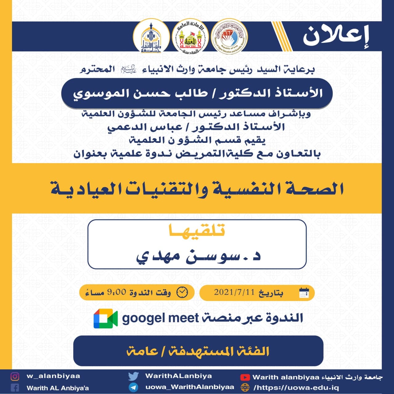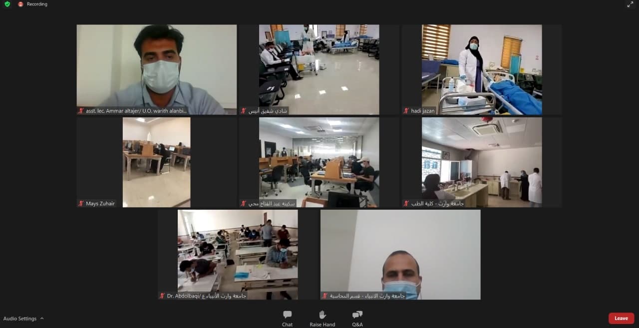 زيارة الفريق الوزاري لمتابعة الامتحانات النهائية الى جامعة وارث الانبياء (عليه السلام) زار الفريق الوزاري المختص بمتابعة الامتحانات النهاية الالكترونية والحضورية جامعة وارث الانبياء (عليه السلام) يوم الاثنين الموافق 2021/7/12 وذلك للاطلاع على سير الامتحانات النهائية في الجامعة خلال الزيارة الكترونيا تم اللقاء مع السيد رئيس الجامعة الدكتور عباس الدعمي و مسؤول التعليم الالكتروني الدكتور حيدر الغانمي وحضر في الاجتماع عدد من التدريسيين من الكليات والاقسام التي تؤدي الامتحان في ذلك الوقت. تم خلال الزيارة تعريف الفريق الوزاري بالاجراءات والتدابير الوقائية التي اتخذتها الجامعة للوقاية من انتقال الاصابات كما تجولت الوزارة الكترونيا في القاعات الامتحانية العملية و التحدث مع عدد من الطلبةفي الختام تقدم الفريق الوزاري لجامعة وارث الأنبياء (عليه السلام) وللكوادر بالشكر والثناء واشادوا بمستوى الجهوزية العالي الذي اعدته الجامعة في الاستعداد للامتحانات النهائية وكذلك اشادوا بالشكر على تواجد الكليات بشكل متواصل في منصات المتابعة الوزارية.