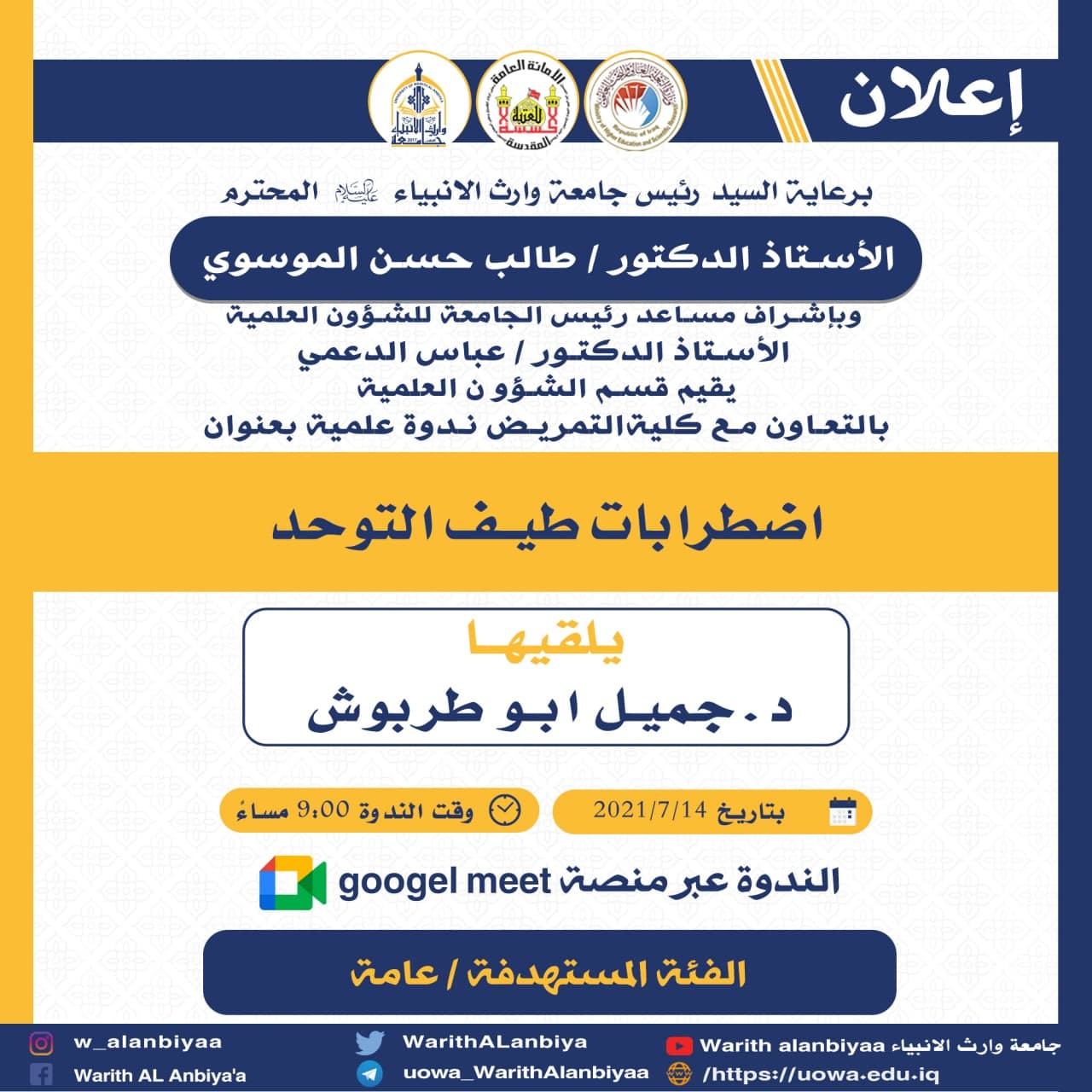 تيمنا بذكرى زواج النورين الامام علي عليه السلام من السيدة الكبرى فاطمة الزهراء عليها السلام.. تقيم كلية العلوم الإسلامية حفلا لتكريم الطلبة الفائزين بالمسابقات العلمية والثقافية التي أجرتها الكلية خلال العام الدراسي الحالي وذلك في يوم الاثنين الموافق ١٢ / ٧ / ٢٠٢١ في تمام الساعة العاشرة صباحا على القاعة المدرجة في بناية العلى
