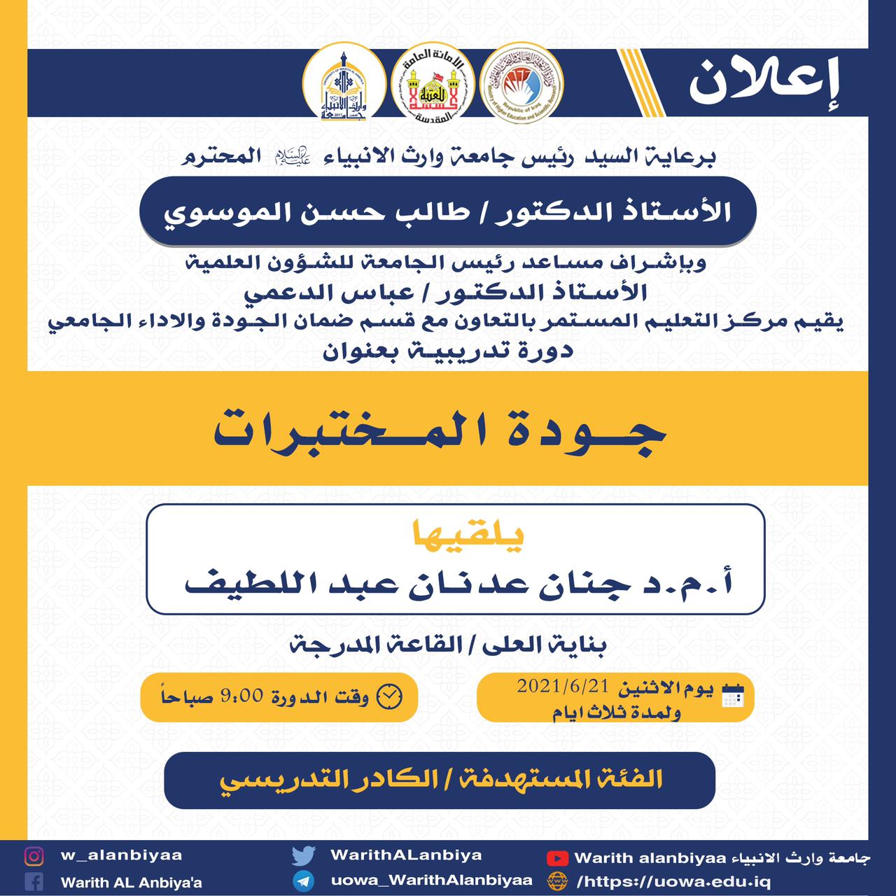 ضمن سعي جامعة وارث الانبياء (عليه السلام) في تطوير كوادرها وجودة مختبراتها العلمية اختتم يوم الاثنين الموافق 2021/6/21 اليوم الاول من دورة جودة المختبرات و التي ستنجز على مدى ثلاث ايام يعقبها اختبار ستجرية الجامعة للمشاركين ليضمن اجتيازهم الدورة و حصولهم على شهادات مشاركة ، علما ان هذه الشهادات من الواجب توفرها عند مسؤولي وفنيي المختبرات ضمن استمارات تقييم جودة المختبرات والتي تحاضر في الدورة أ.م.د جنان عدنان عبد اللطيف من جامعة الكرخ للعلوم.