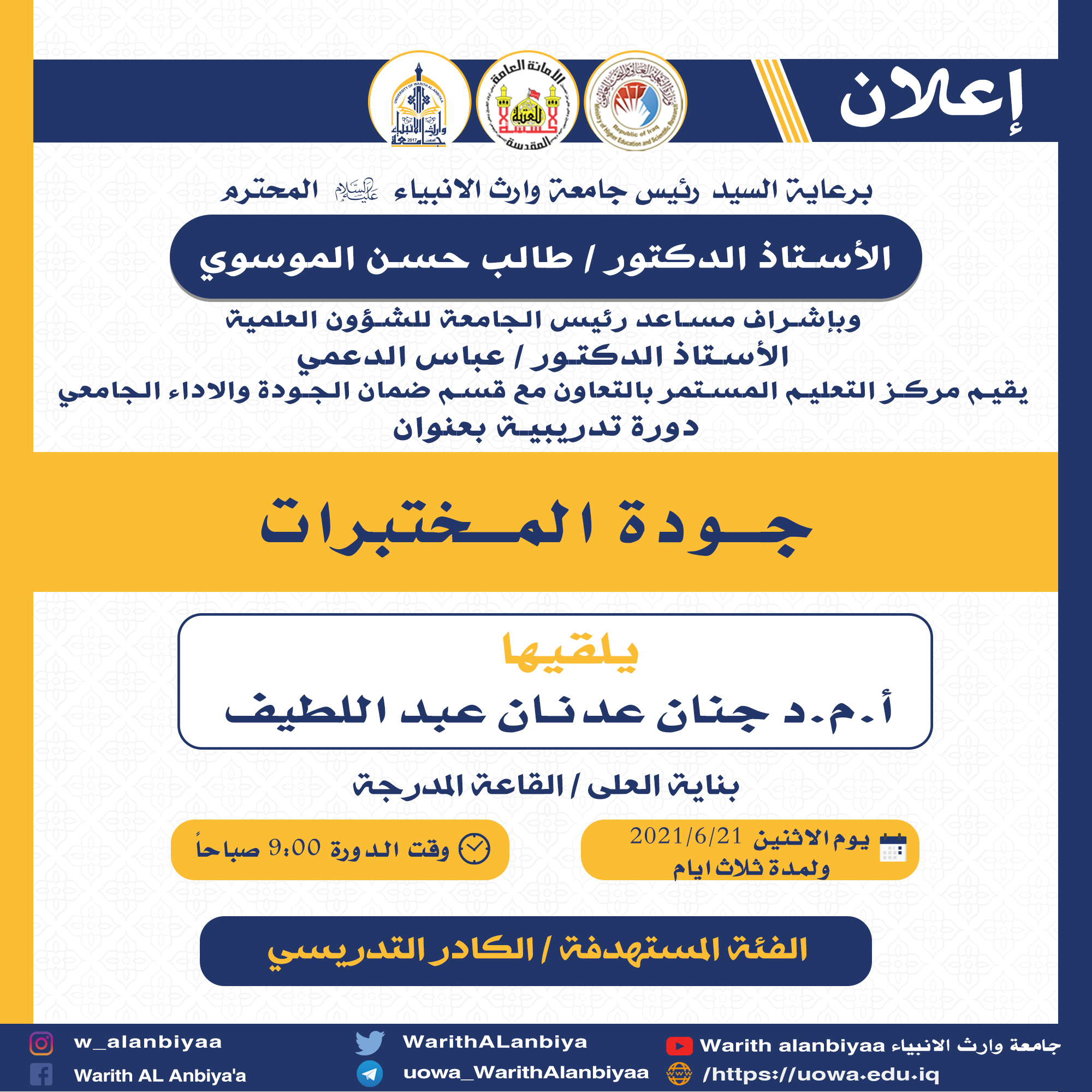 قريبا ..انطلاق فعاليات برنامج قمم التدريبي تعلن كلية العلوم الإسلامية في جامعة وارث الانبياء عن موعد انطلاق برنامج قمم التدريبي والذي تقدمه بالتعاون مع أكاديمية الوارث للتنمية البشرية والدراسات الإستراتيجية. الجهة المستهدفة طلبة جامعة وارث الانبياء عليه السلام... موعدنا الخميس ١٧/٦/٢٠٢١
