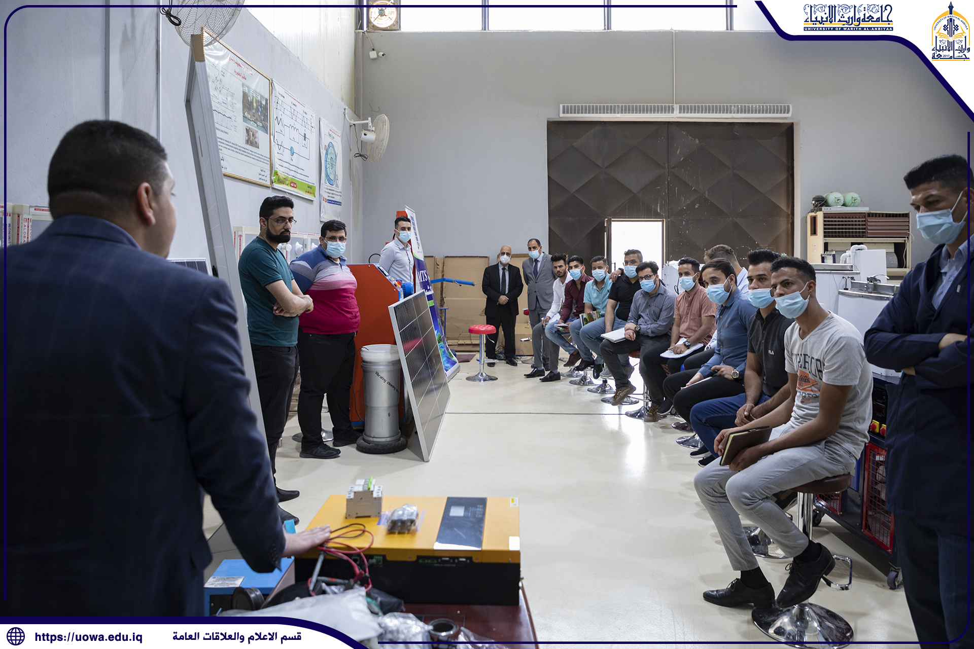 برعاية السيد المساعد العلمي لجامعة وارث الأنبياء وبأشراف مباشر من السيد عميد كُلْيَة الهندسة المحترم والسيد رئيس قسم هندسة تقنيات التكييف والتبريد أقيمت ورشة عملية في نصب منظومات شمسية وعلى مدى ثلاث أيام من قبل أساتذة قسم التكييف والتبريد وكادر شركة متخصص في هذا المجال وتستهدف هذه الورشة طلبة المرحلة الرابعة حيث يشمل البرنامَج التدريبي في اليوم الأول على التعرف على أنواع الخلايا الشمسية ومكونات المنظومات الشمسية وكيفية ربطها على التوالي والتوازي وقياس زاويه الأسقاط الشمسي وقياس كفائتها عند زوايا معينه وتأثير نسبه الظل على مقدار الفولتيه المتحققة وفي اليوم الثاني سيتدرب الطلبة على كيفية أجراء الصيانة على جهاز الانفيرتر والتعرف على طريقة عملة وكيفية استبدال القطع والعناصر التالفه فيه بوضع اخرى مشابه او مكافئة يتم استخراجها وفق جداول علمية أما اليوم الثالث سيتم تدريب الطلبة على كيفية اختيار النوع الملائم من المنظومات الشمسية لمشروع معين وكيفية تحديد معايير اختيار المنظومة المناسبة. ولله ولي التوفيق…