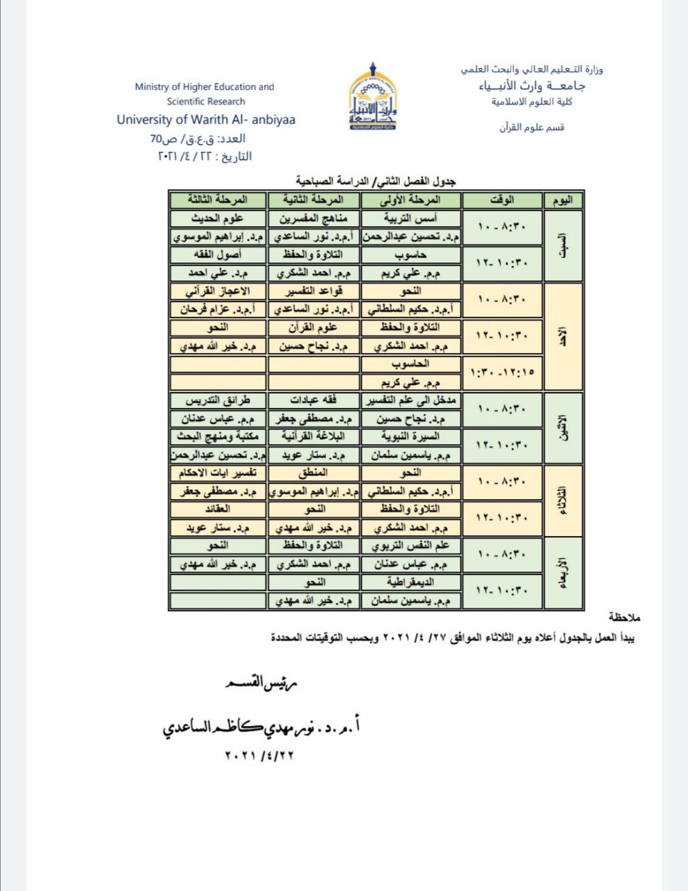 جدول الدروس الأسبوعي لقسم علوم القرآن / للمراحل الثلاث الدراسة المسائية