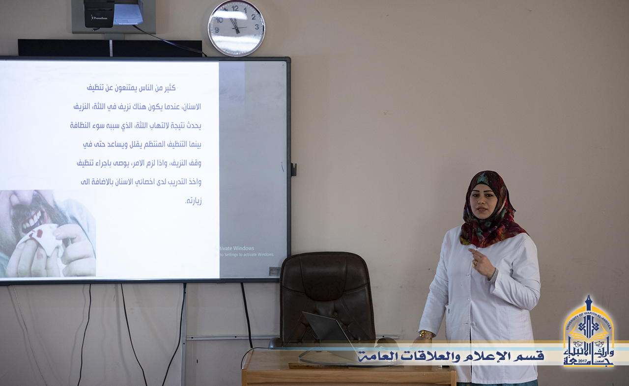اقام قسم التعليم المستمر وكلية التمريض في جامعة وارث الانبياء(عليه السلام) وبالتعاون مع مركز الحر الرياحي التخصصي لطب الاسنان ندوة توعوية تثقيفية خاصة بصحة الفم والاسنان في جامعة وارث الانبياء(عليه السلام) ، حضر الندوة السيد رئيس الجامعة الاستاذ الدكتور طالب حسن موسى الموسوي وبعض السادة العمداء ومجموعة من التدريسيين والطلبة ، وقد تحدثت مقدمة الندوة الدكتورة شيماء عباس قائلة :الندوة تناولت التوعية وبعض الاخطاء الشائعة خلال علاج الاسنان وبعض المفاهيم الخاطئة السائدة بين الناس ، الهدف منها التوعية العامة وتوعية الطلبة لانهم جيل المستقبل لكي يهتموا بنظافة الاسنان واللثة ، واضافت المتحدثة أن الندوة تطرقت الى الامراض التي تصيب الانسان عبر الفم لان الفم هو مرآة لما يحتويه الجسم والكثير من الامراض تظهر اعراضها في الاسنان قبل الجسم .