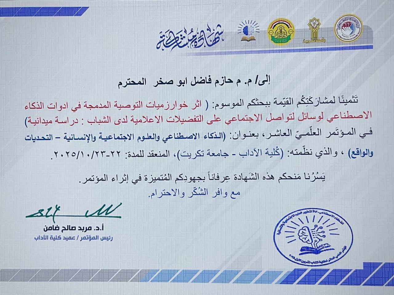 الاثر الاعلامي لخوارزميات الذكاء الاصطناعي في دراسة علمي شارك بها تدريس من كلية الاعلام في مؤتمر كلية الاداب بجامعة تكريت