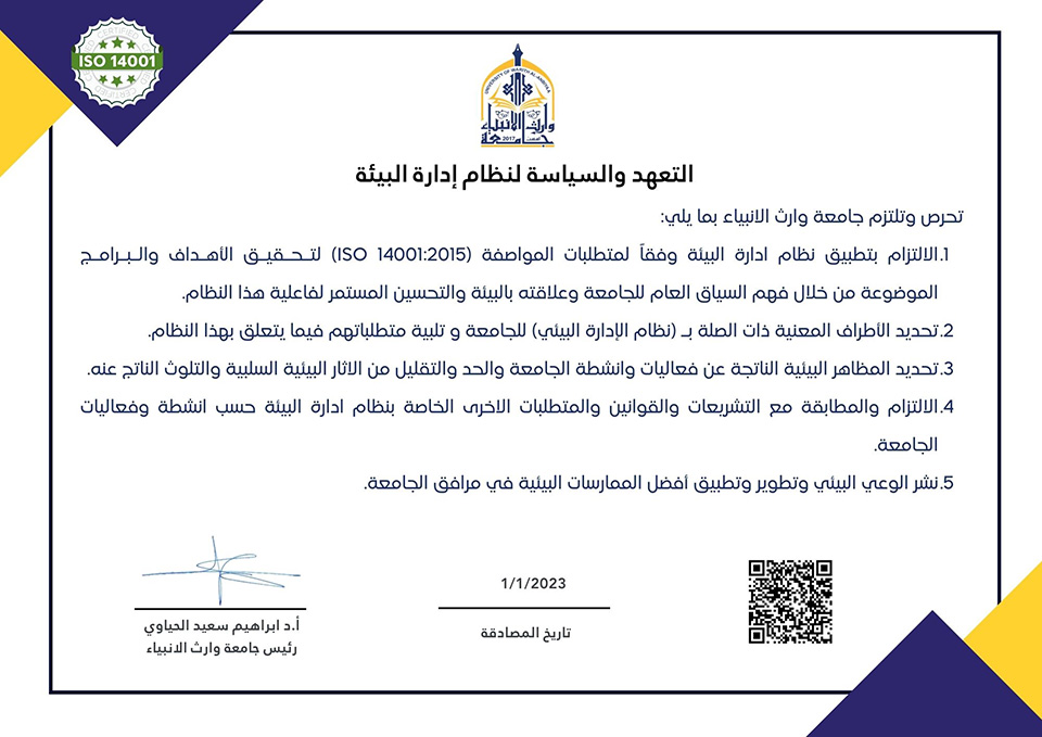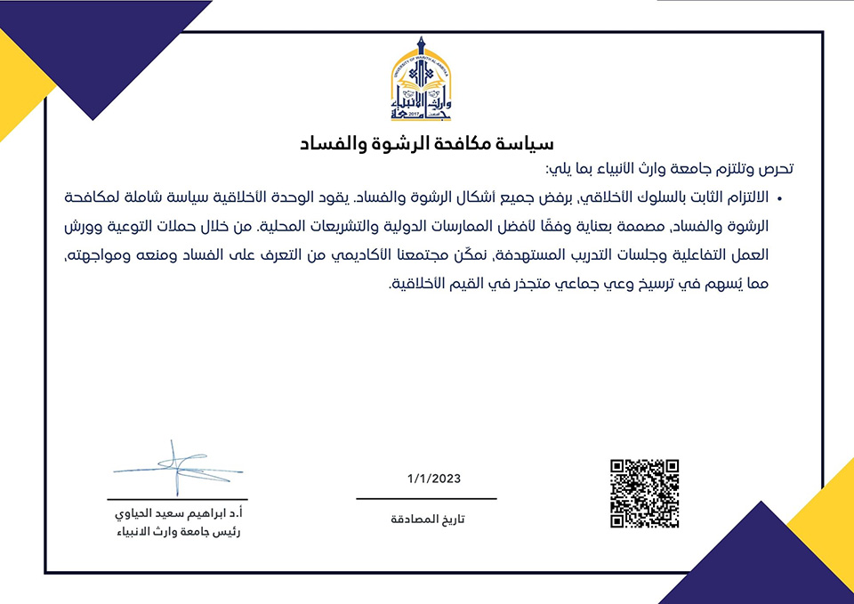 تحرص وتلتزم رئاسة جامعة وارث الانبياء بما يلي:
