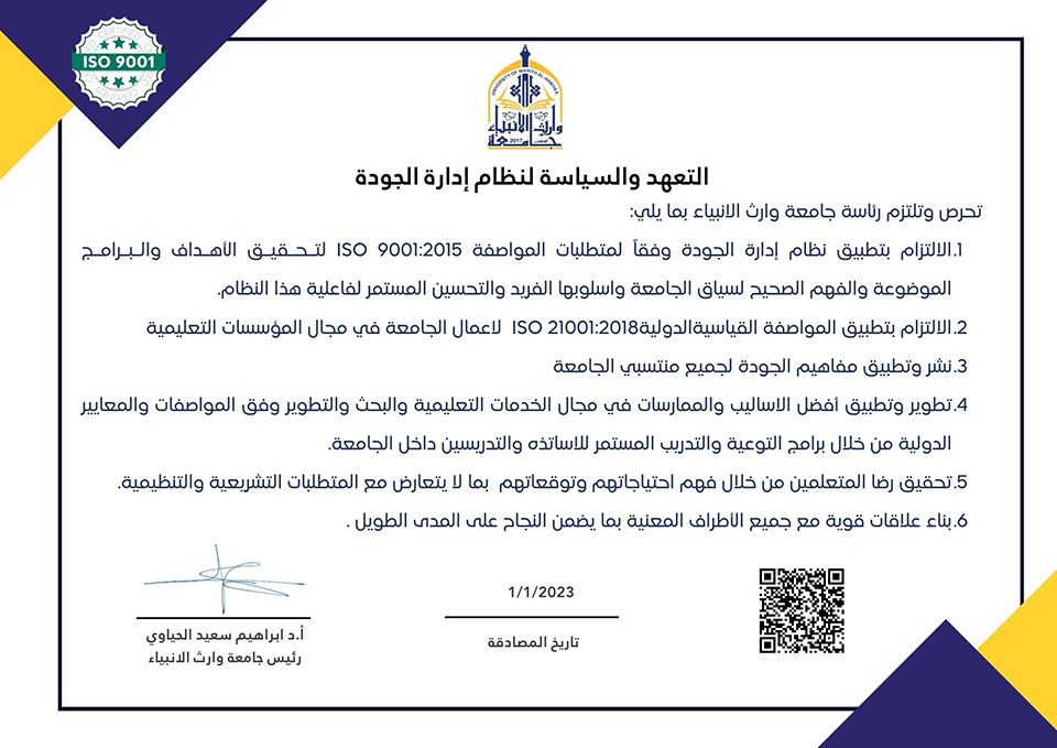 سياسة الجودة في كلية الهندسة – جامعة وارث الأنبياء (عليه