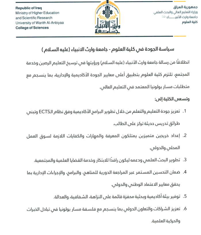 سياسة الجودة في كلية العلوم - جامعة وارث الانبياء (عليه