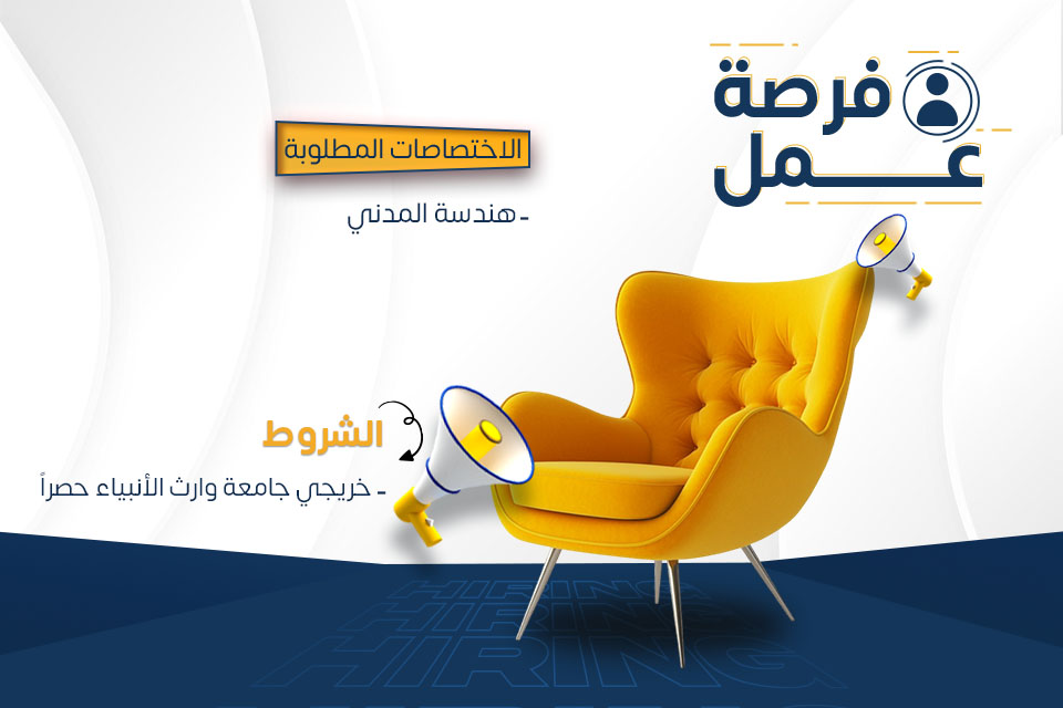 تُعلن جامعة وارث الأنبياء (ع) عن توفر وظائف شاغرة في قسم المشاريع الهندسية، وذلك لخريجي جامعة وارث الأنبياء حصراً من تخصص الهندسة المدنية و لكلا الجنسين