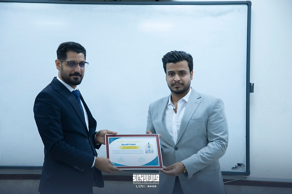 على هامش "المؤتمر العلمي الدولي الثاني"لكلية الإدارة والاقتصاد في جامعة وارث الانبياء(عليه السلام) ، قدمت عمادة الكلية درع الشكر والتقدير الى السيد مساعد رئيس جامعة كربلاء للشؤون الإدارية الاستاذ الدكتور اكرم الياسري ، وعميد كلية الادارة والاقتصاد في جامعة كربلاء الاستاذ المساعد الدكتور هاشم جبار الحسيني.