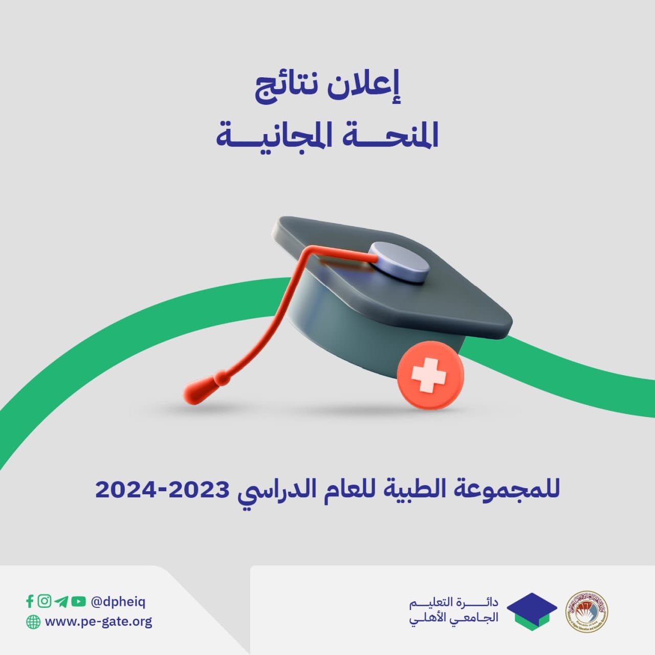 تعلن وزارة التعليم العالي والبحث العلمي قبول ثلاثة آلاف ومئتين وثلاثة طلاب ضمن المنحة المجانية الخاصة بالمجموعة الطبية (طب، طب أسنان، الصيدلة) في الجامعات والكليات الأهلية للعام الدراسي 2024/2023.