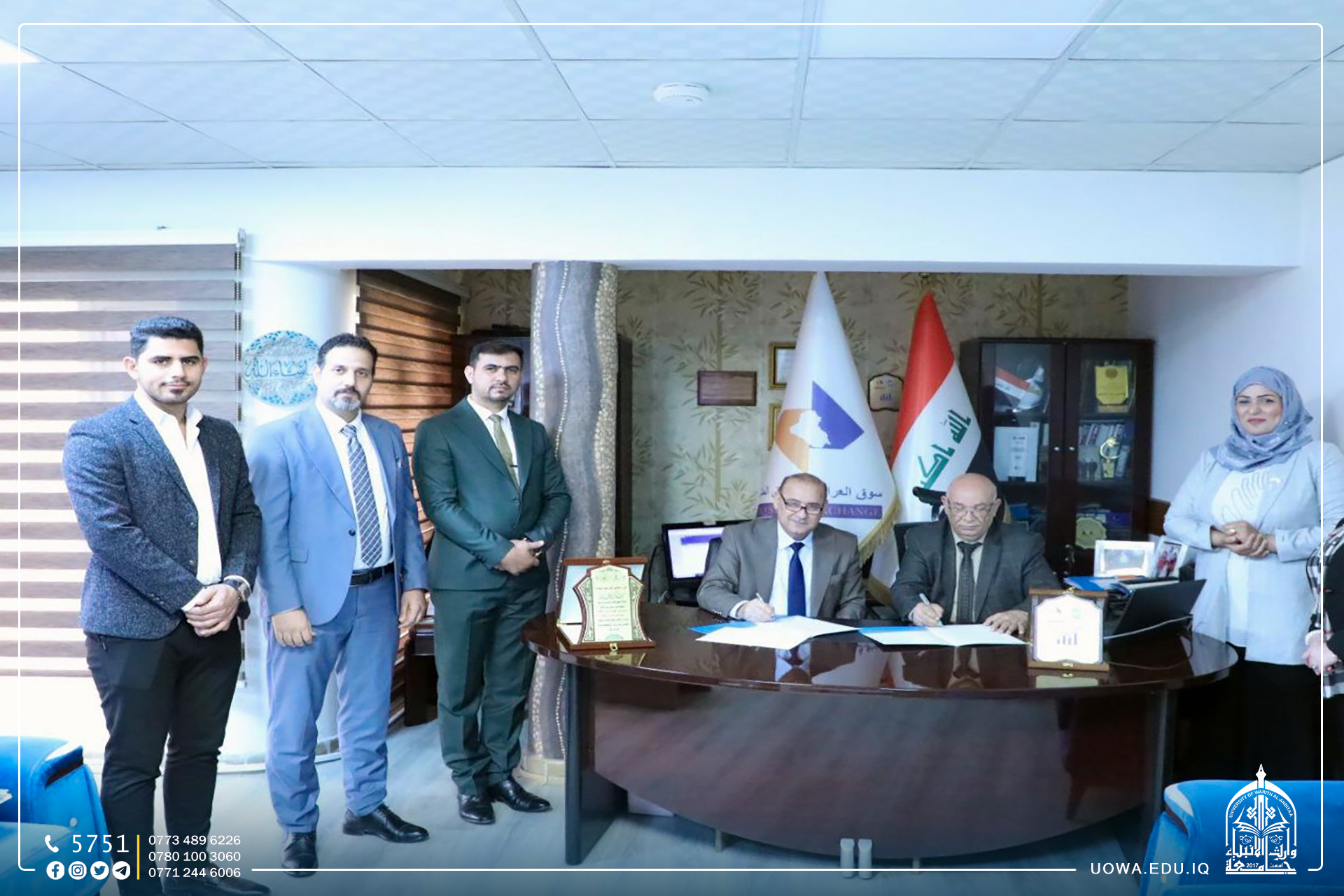 "سوق العراق للأوراق المالية"، وجاءت هذه الاتفاقية ببنود تضمنت الزيارات العلمية والورش والندوات التي تسهم في رفع المستوى العلمي لطلبة الكلية، و تضمنت الزيارة ايضا الاطلاع على اليات نشاط شركات الوساطة في قاعة التداول وانواع البيانات والمعلومات التي يقدمها التداول الإلكتروني في السوق.