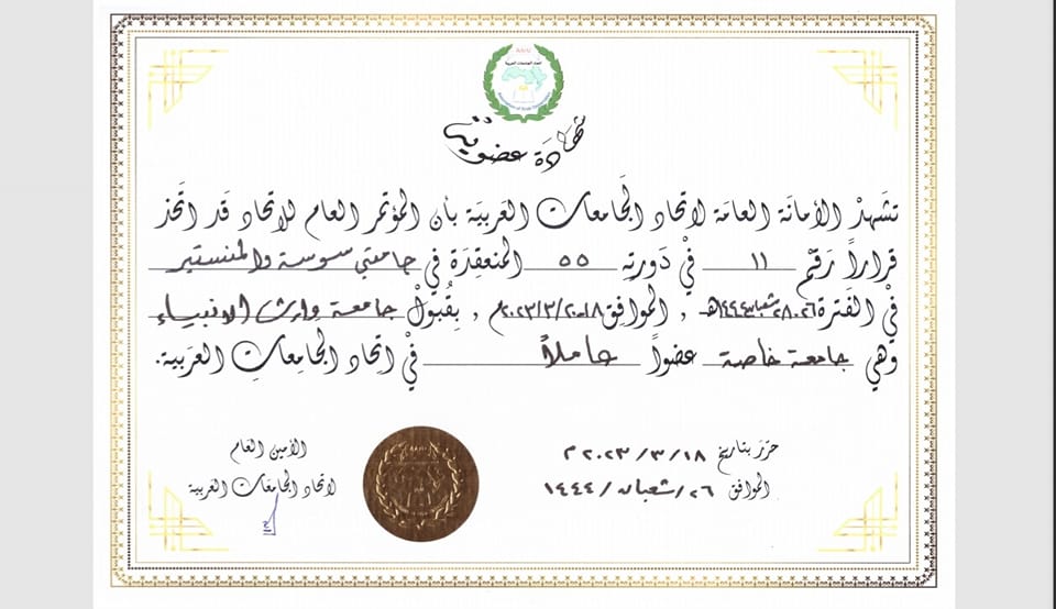 ضمن سعيها الحثيث في الانفتاح على الجامعات العربية والعالمية حصلت جامعة وارث الانبياء(عليه السلام) على عضوية اتحاد الجامعات العربية الذي يضم العديد من الجامعة والمؤسسات التعليمية، هدفها التعاون والمساهمة في البحوث والمؤتمرات العلمية والفعاليات الأكاديمية، واعداد البرامج وتسهيل المهمات الاكاديمية والعلمية.