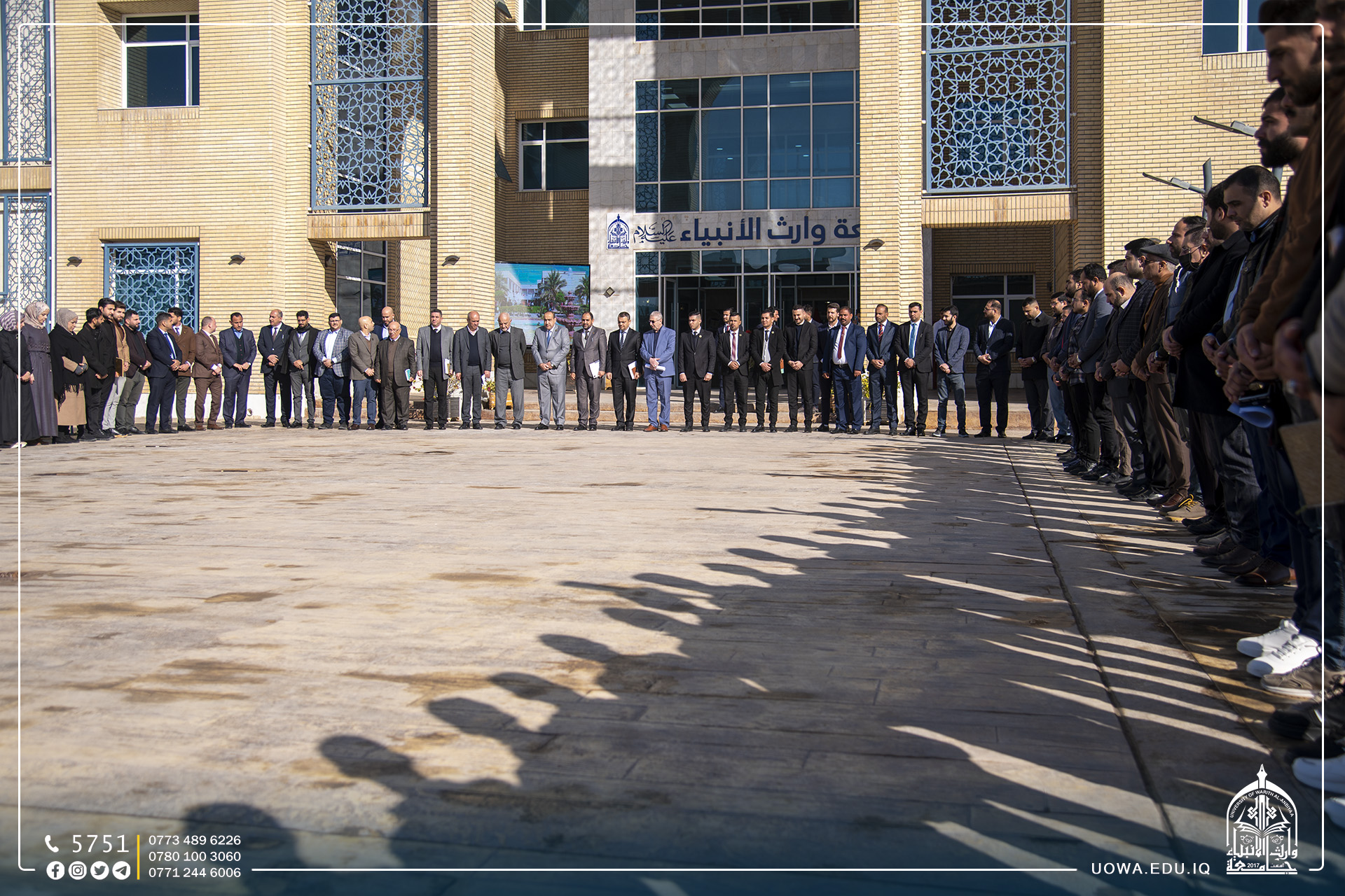 رئاسة جامعة وارث الانبياء(عليه السلام) تنظم وقفة حداد لقراءة سورة الفاتحة بمناسبة الذكرى السنوية الثالثة لاستشهاد قادة معارك النصر على التنظيمات الارهابية.