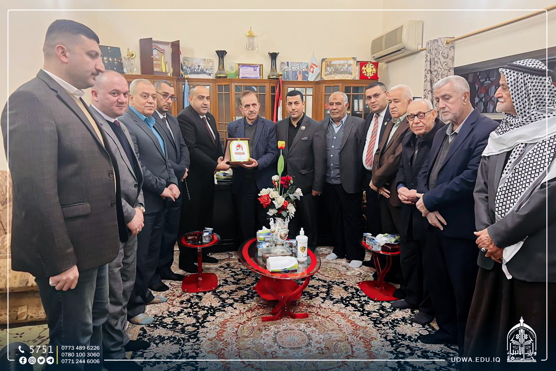 استقبل السيد رئيس الجامعة الاستاذ الدكتور ابراهيم الحياوي بمؤسس فريق عطاء طلبة وارث الانبياء السيد احمد الهر بحضور السيد رئيس قسم ضمان الجودة م.علي عبد الزهرة، للتعرف على اخر نشاطات الفريق وتاكيد دعم رئاسة الجامعة لنشاطاتهم الانسانية ومشاريعهم الخيرية داخل وخارج الجامعة.