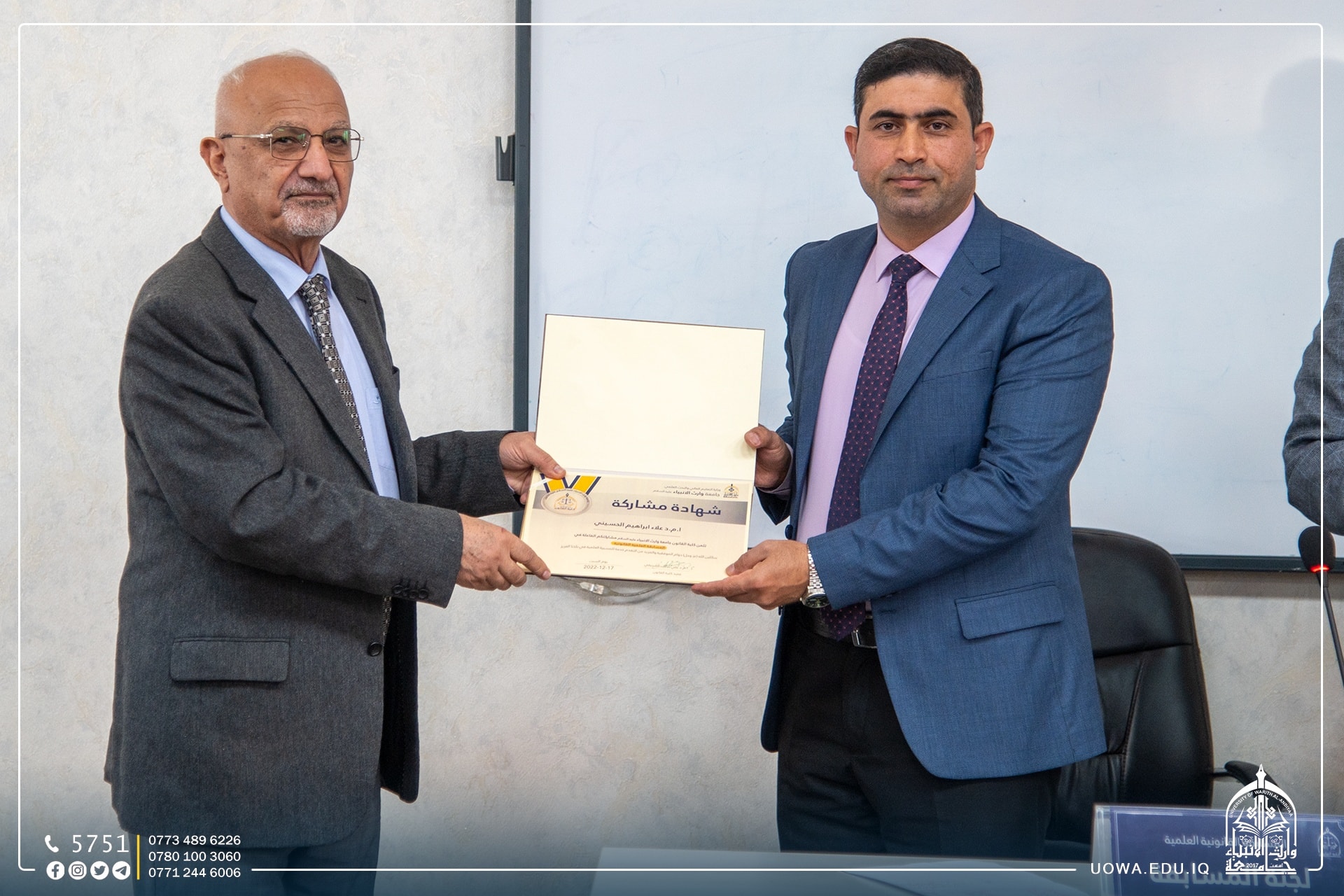 ومن جانبها قدمت عمادة كلية الادارة والاقتصاد في جامعة كربلاء كتاب شكر وتقديرالى الدكتور فهد مغيمش تثميناً لجهوده وسعيه في دعم العملية التعليمية .