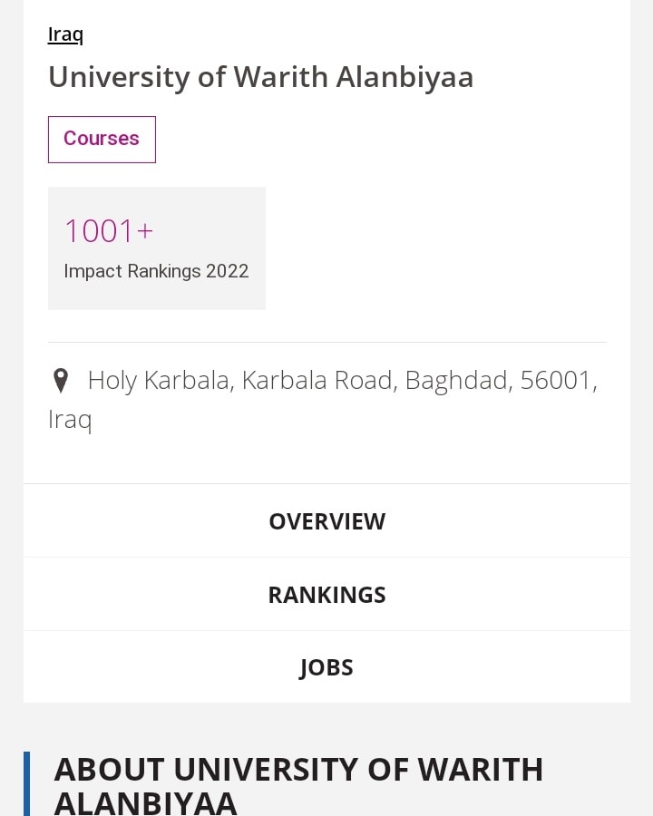 حصلت جامعة وارث الانبياء (عليه السلام) على المرتبة + 1001 من اصل 1406جامعة في تصنيف التايمز البريطاني للتنمية المستدامة للعام 2022واعلنت وزارة التعليم العالي والبحث العلمي عن دخول (47) جامعة وكلية حكومية وأهلية عراقية في التصنيف، حققت مواقع تنافسية، حيث اشتمل الموقع على 1406 مؤسسة من 106 دولة حول العالم.ويعتمد تصنيف التايمز البريطاني للتنمية المستدامة على عدد من المعايير، منها جودة التعليم والصحة والرفاه والشراكات والصناعة والابتكار وغيرها.للاطلاع على النتائج يرجى الدخول عبر الرابط ادناه: (https://www.timeshighereducation.com/.../university...)