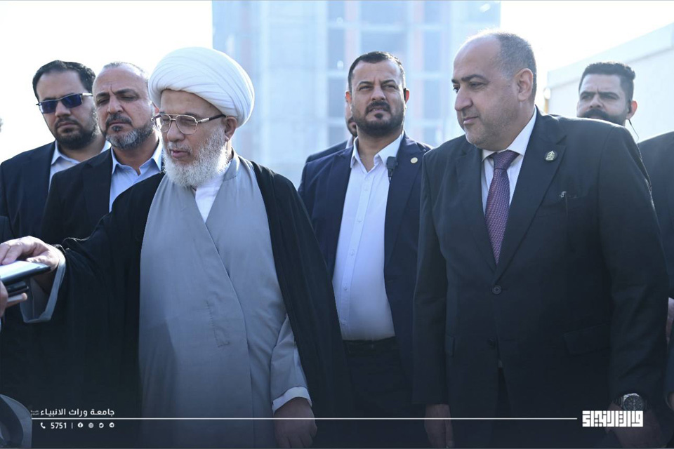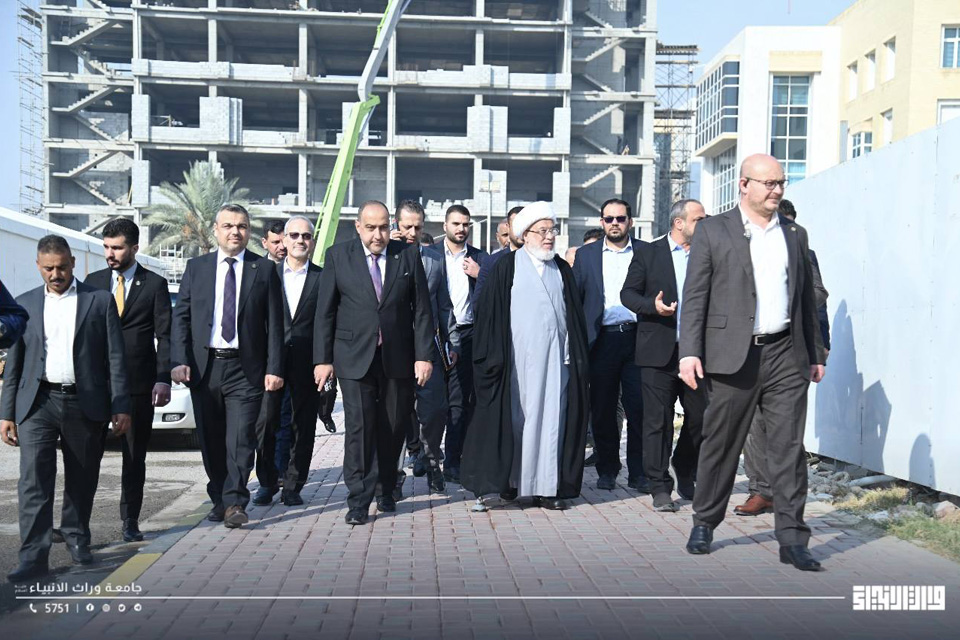 Today, Sheikh Abdul-Mahdi Al-Karbalaei, the representative of the Supreme Religious Authority, visited the University of Warith Al-Anbiyaa, where he was welcomed by the University President, Professor Dr Ibrahim Saeed Al-Hayyawi. The visit formed part of an inspection tour to review ongoing expansion and development projects within the university, undertaken as part of its strategic plans to enhance the quality of education and develop the campus environment.
