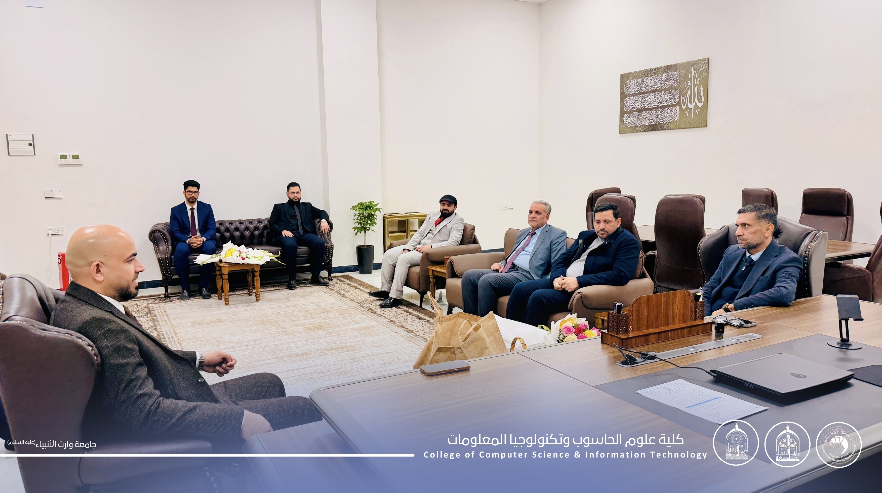 The Dean of the College of Computer Science and Information Technology, Assistant Professor Dr. Haider Mohammed Ali Al-Ghanami, received a high-level delegation from the College of Engineering – Warith Al-Anbiyaa University, headed by Assistant Professor Dr. Hussein Hadi Hussein, Dean of the College, accompanied by a group of faculty members.